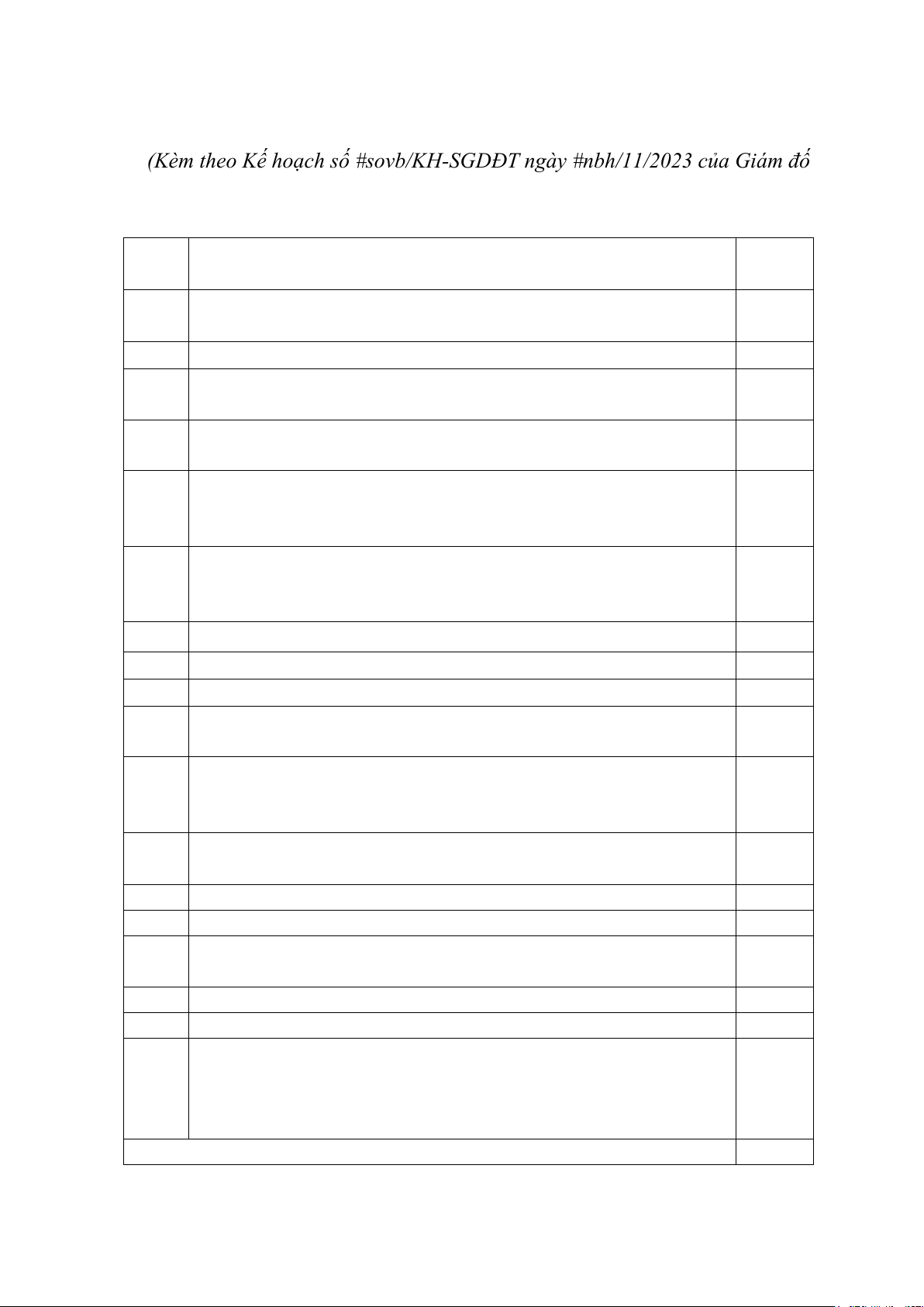 (Kèm theo Kế hoạch số #sovb/KH-SGDĐT ngày #nbh/11/2023 của Giám đốc