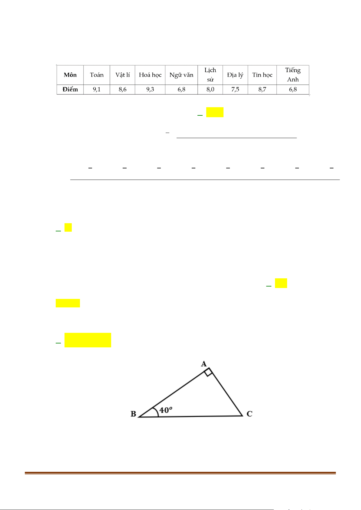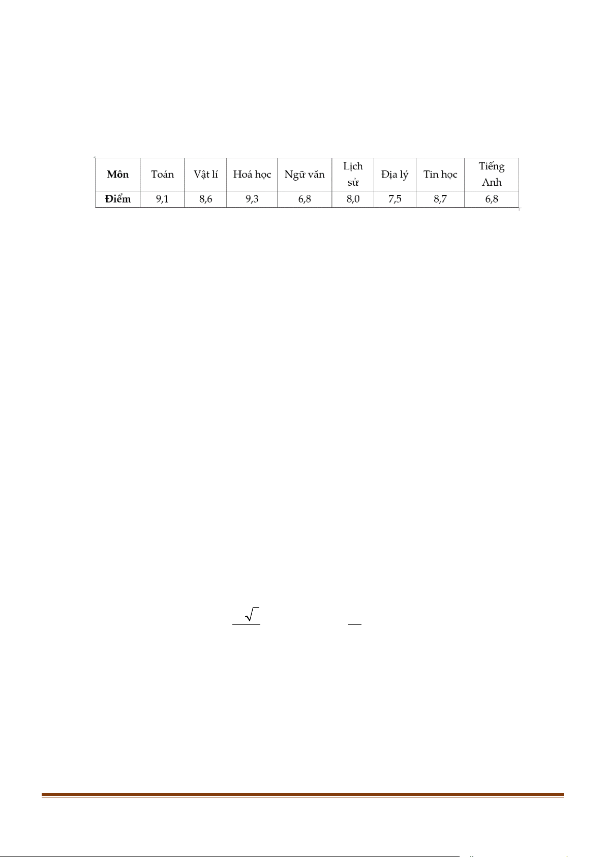 Câu 1: Điểm trung bình từng môn học kì I của bạn An được cho bởi bảng sau: