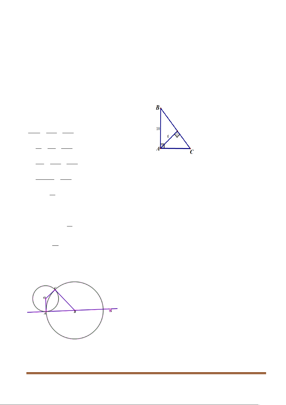 Thế (1) vào (2) ↔ 16 - 12(m+1) – 2020 = 0 ↔ -12m - 2016 = 0 ↔ m = -168 ( t/m) Câu 7. Ta có: 1 1 1 = + 2 2 2 AH AB AC 1 1 1 = + 2 2 2 6 10 AC 1 1 1 = + 2 36 100 AC 64 1 = 2 36.100 AC 15 AC = (cm) 2 Ta có: AH.BC = AB.AC 6.BC = 10.15 2 BC = 25 (cm) 2 Câu 8.