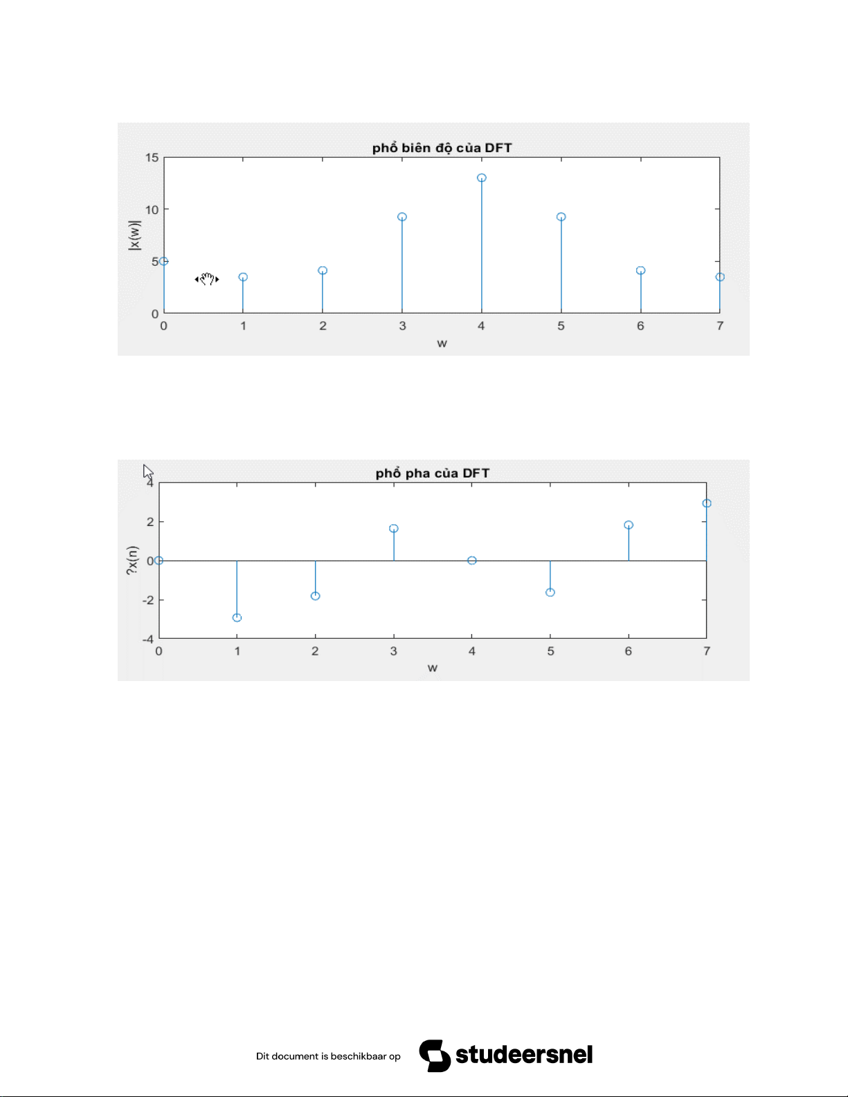 title('phổ biên độ của DFT') xlabel('w') ylabel('|x(w)|') subplot(3,2,5); stem(n,angle(X)); %Đồ thị phổ pha title('phổ pha của DFT') xlabel('w') ylabel('?x(n)') Y=ifft(X); subplot(3,2,6); stem(n,Y);