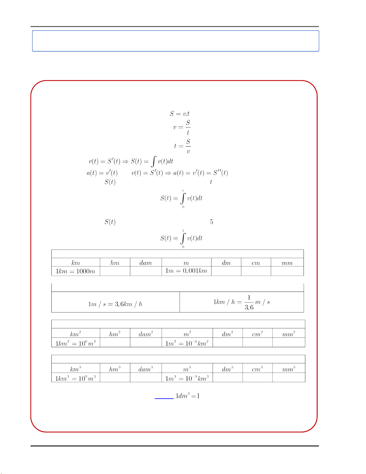 Thời gian = (quãng đường)/(vận tốc): . Vận tốc: . Gia tốc: mà . Quãng đường