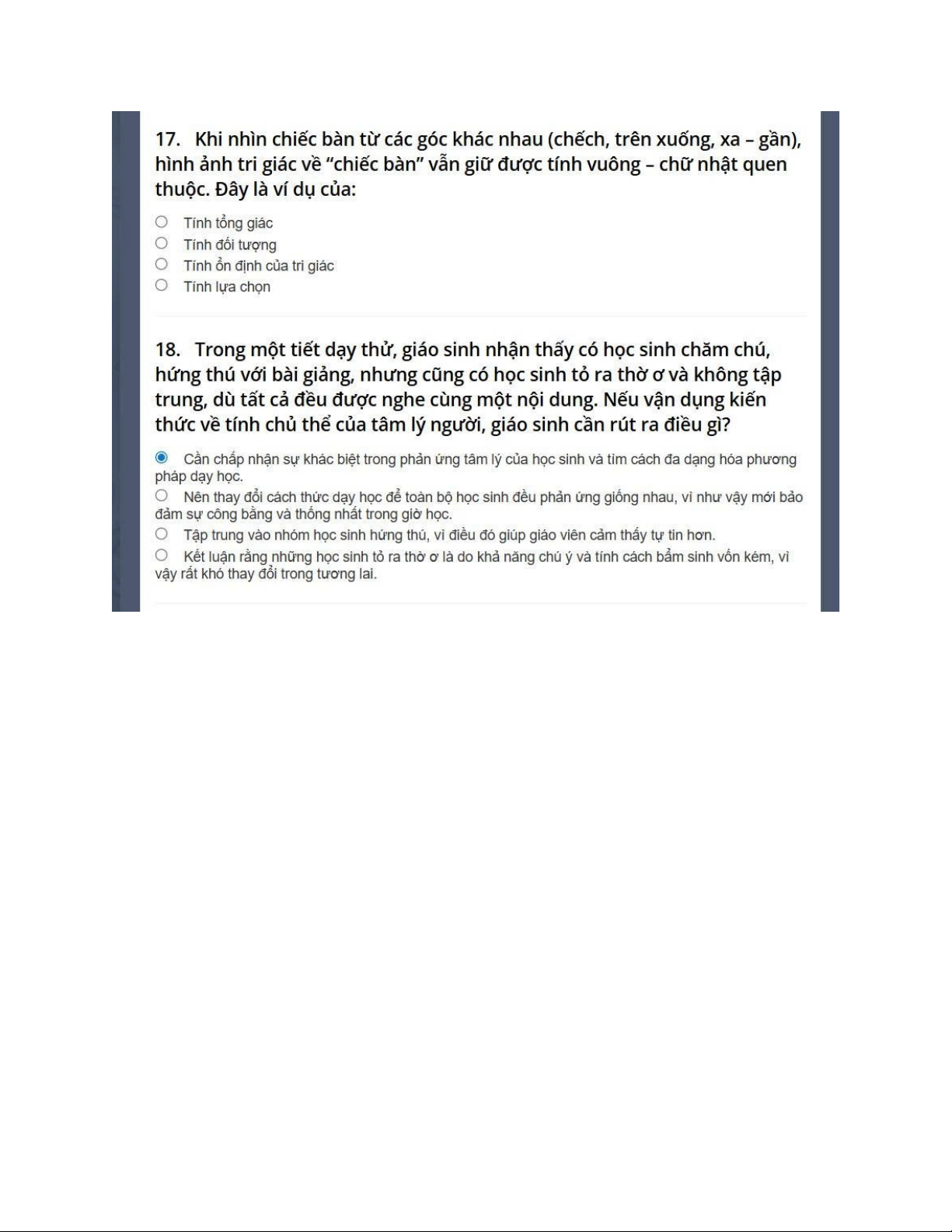 Khi nhìn chiếc bàn từ các góc khác nhau (chếch, trên xuống, xa - gần), hình ảnh tri giác về