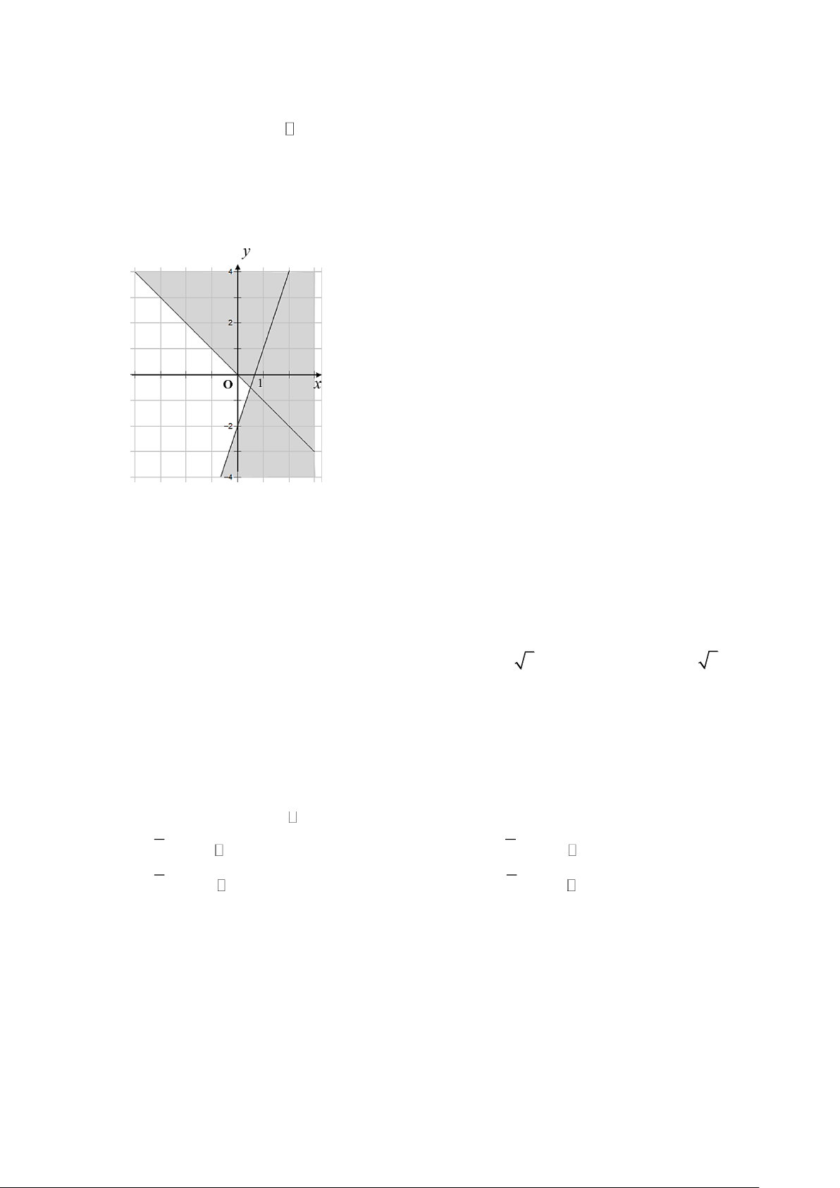 Câu 15. Miền không bị gạch chéo (kể cả bờ) trong hình vẽ dưới đây là miền nghiệm của bất phương trình: