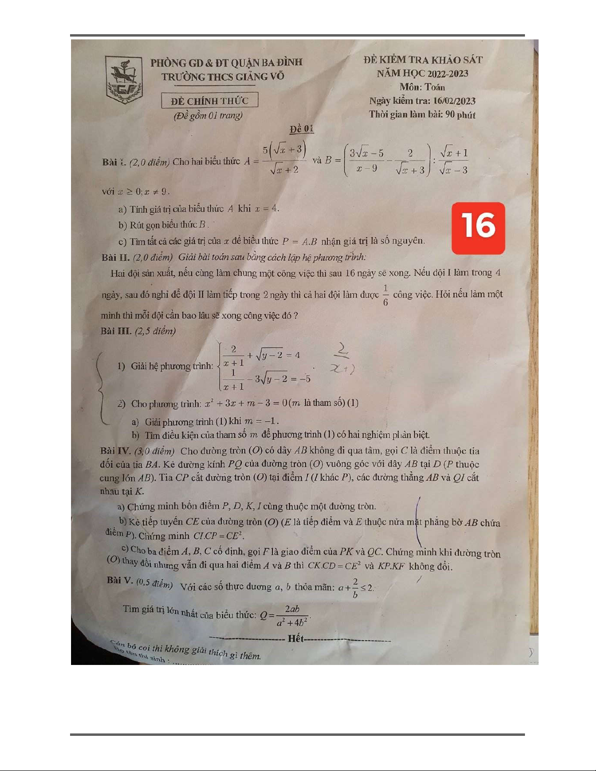 ĐỀ KHẢO SÁT CHẤT LƯỢNG THCS GIẢNG VÕ Năm học 2022-2023 Đề 1 MÔN: Toán 9