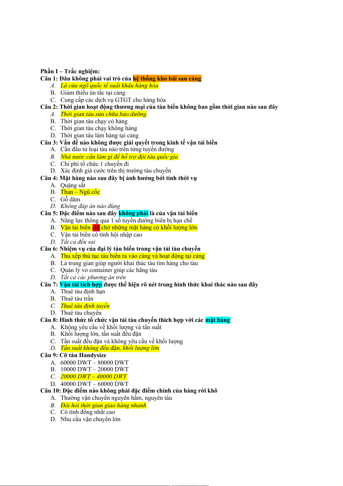 Câu 15: Đặc điểm của môi trường sản xuất vận tải biển A. Không giới hạn B. Thay đổi
