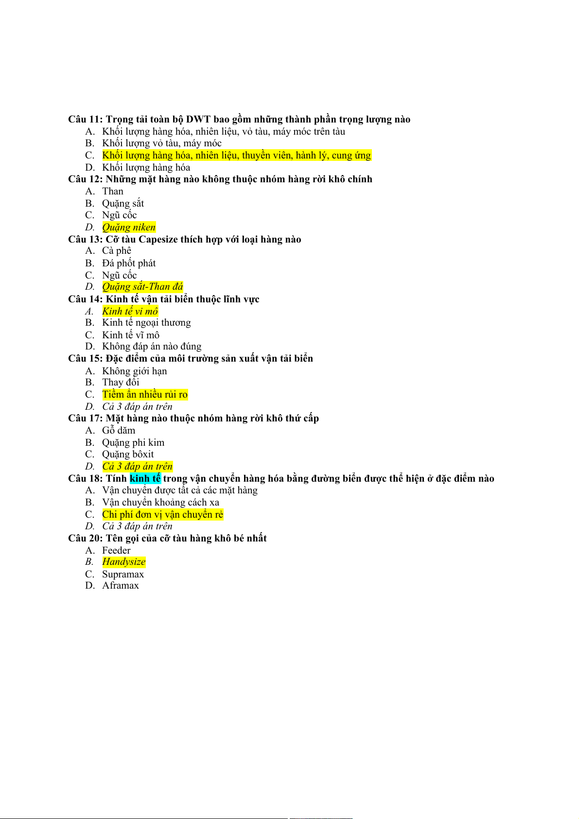 Câu 9: Cỡ tàu Handysize A. 60000 DWT – 80000 DWT B. 10000 DWT – 20000 DWT C. 20000 DWT – 40000 DWT D. 40000 DWT – 60000 DWT