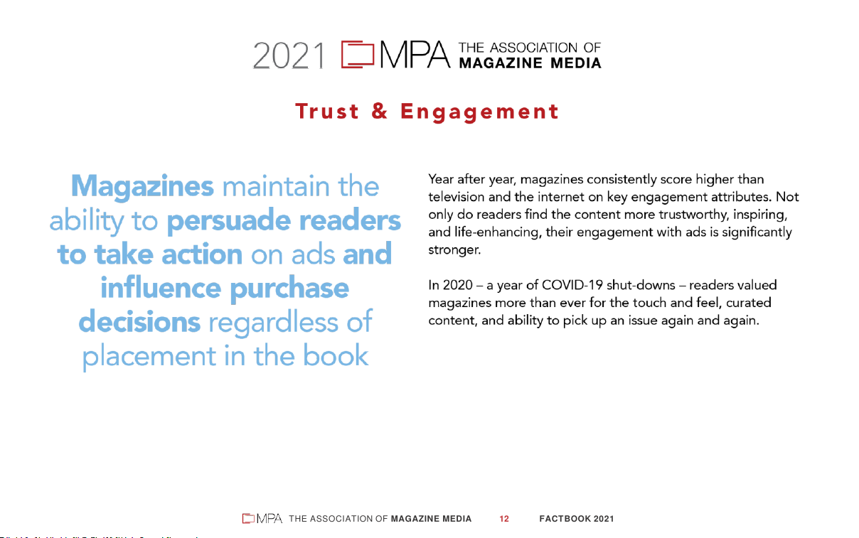 I am pleased to present the 2021 Magazine Media Factbook. For more than 25 years, MPA – The Association of Magazine
