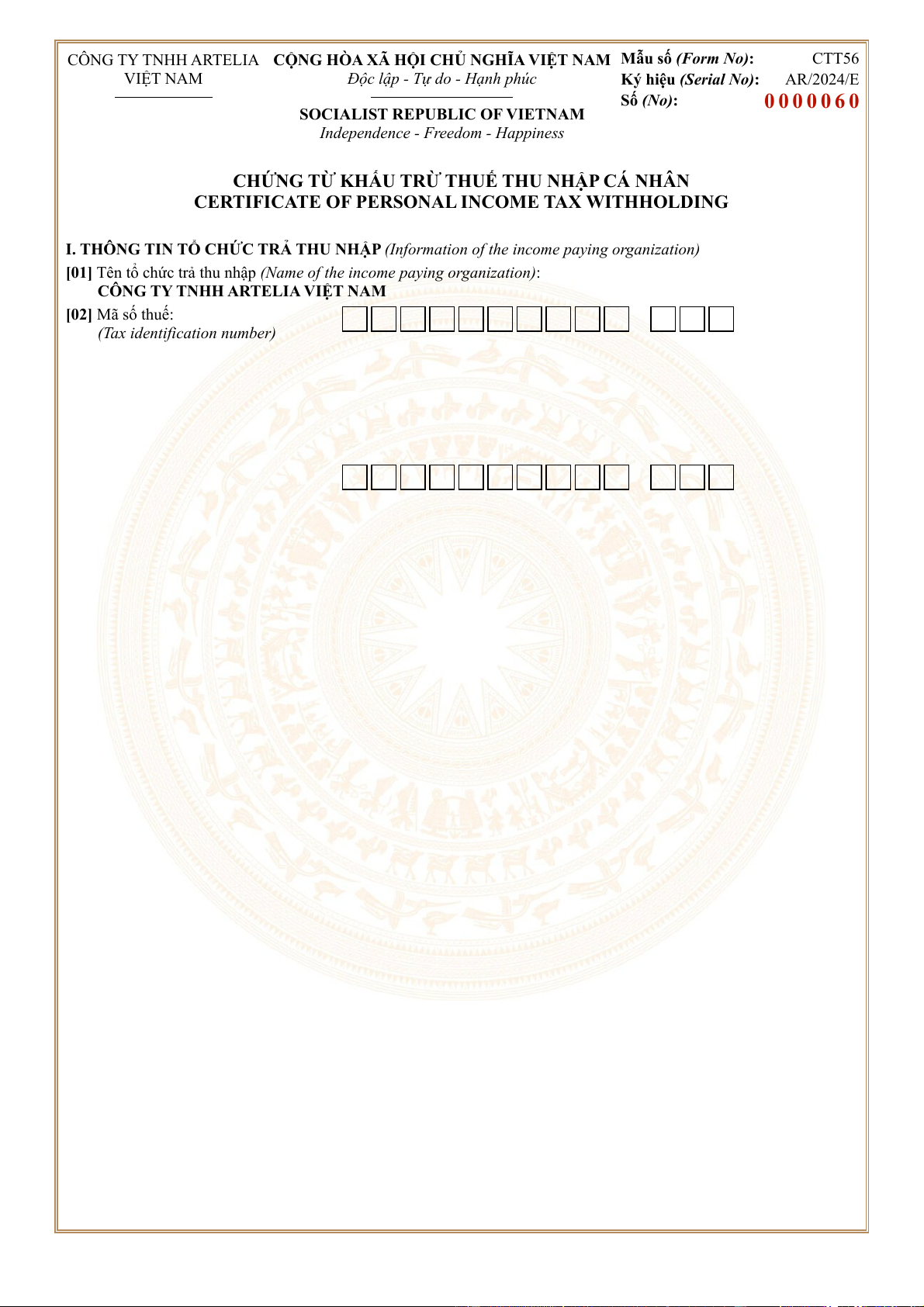 CÔNG TY TNHH ARTELIA CỘNG HÒA XÃ HỘI CHỦ NGHĨA VIỆT NAM Mẫu số (Form No): CTT56 VIỆT NAM