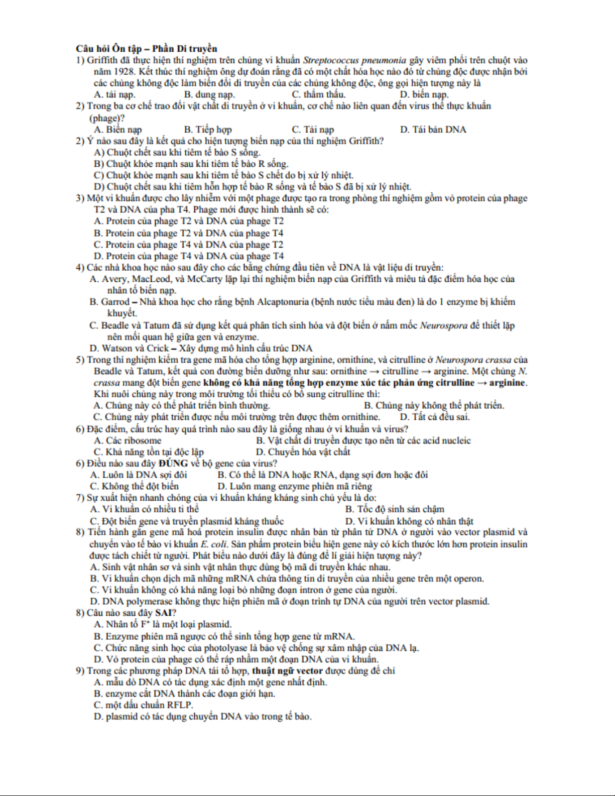 Câu hỏi ôn tập phần Di truyền môn Sinh học di truyền | Trường Đại học Nam Cần Thơ