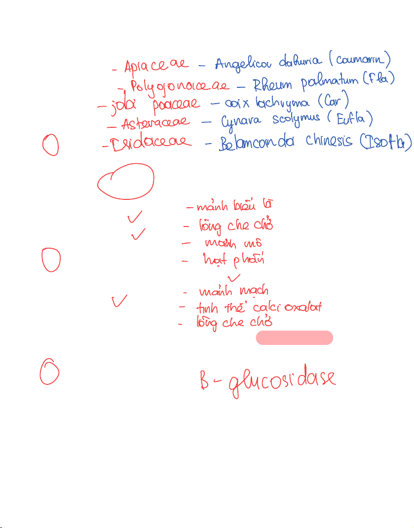 5. Khi soi bột hoa hòe dưới kính hiển vi, không tìm thấy đặc điểm: A. Mảnh mạch B. Hạt tinh bột C. Bó sợi