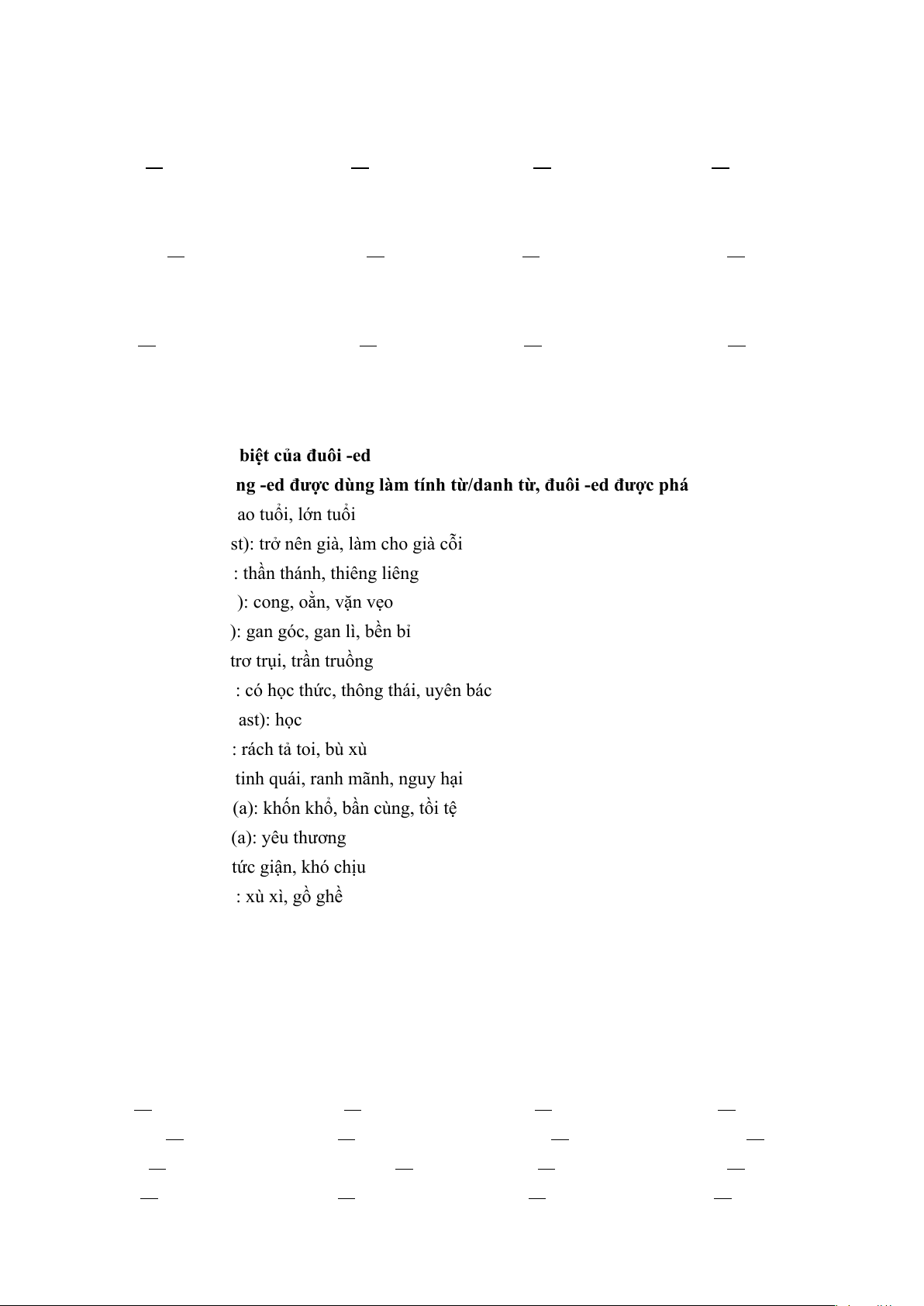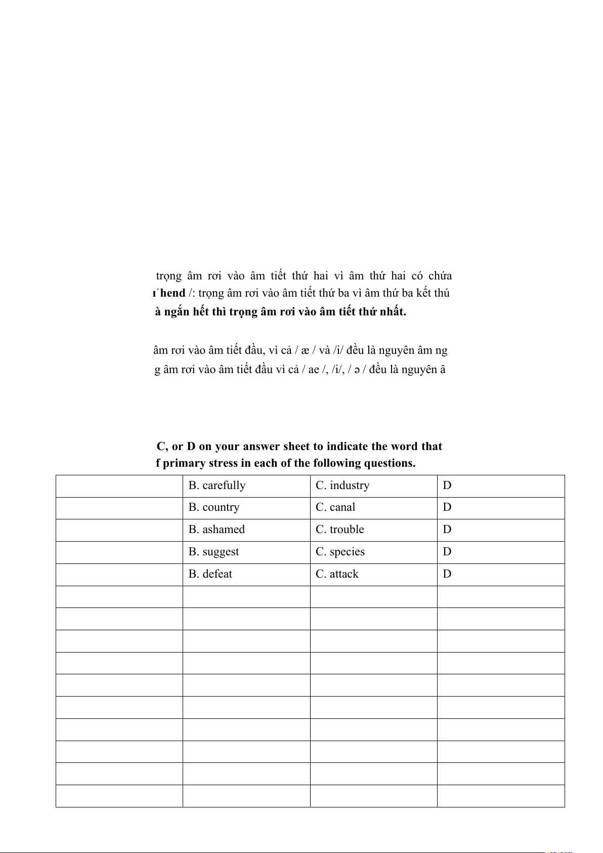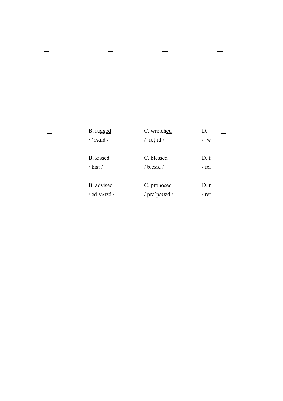 16. crabbed / kræbid /(a): càu nhàu, gắt gỏng Bài tập áp dụng 1. A. naked B. looked C. crooked D. wicked 2. A. concerned B. raised C. developed D. maintained 3. A. laughed B. photographed C. coughed D. weighed 4. A. looked B. naked C. cooked D.booked 5. A. communicates B. mistakes C. loves D. hopes 6. A. manages B. laughs C. photographs D. makes 7. A. traveled B. learned C. landed D. fastened 8. A. beloved B. learned C. used D.ragged 9. A. unmatched B. learned C. beloved D. sacred 10. A. naked B. beloved C. learned D.ragged 11. A. scared B, hatred C. aged D. crabbed 12. A. used B. blessed C. cursed D. dogged 13. A. wicked B. rugged C. wretched D. worked 14. A. increased B. kissed C. blessed D. faced 15. A. crabbed B. advised C. proposed D. raised Đáp án 1. A. naked B. looked C. crooked D. wicked / ˈneɪkɪd / / ˈlʊkt / / krʊkɪd / / ˈwɪkɪd / Đáp án: B 2. A. concerned B. raised C. developed D. maintained / kənˈsəːnd / / reɪzd / / dɪˈveləpt / / meɪnˈteɪnd / Đáp án: C 3. A. laughed B. photographed C. coughed D. weighed / lɑːft / / ˈfəʊtəɡrɑːft / / kɒft / / weɪd / Đáp án: D 4. A. looked B. naked C. cooked D.booked / ˈlʊkt / / ˈneɪkɪd / / kʊkt / / bʊkt / Đáp án: B 5. A. communicates B. mistakes C. loves D. hopes / kəˈmjuːnɪkeɪts / / mɪˈsteɪks / / ˈlʌvz / / həʊps / Đáp án: C 6. A. manages B. laughs C. photographs D. makes / ˈmænɪdʒɪz / / lɑːfs / / ˈfəʊtəɡrɑːfs / / ˈmeɪks / Đáp án: A 7. A. traveled B. learned C. landed D. fastened / ˈtrv(ə)l̩d / / ləːnd / / ˈlandɪd / / ˈfɑːs(ə)n̩d / Đáp án: C 8. A. beloved B. learned C. used D.ragged / bɪˈlʌvɪd / / ləːnid / / ˈjuːzd / / raɡid / Đáp án: C 9. A. unmatched B. learned C. beloved D. sacred / ʌnˈmatʃt / / lɜːnid / / bɪˈlʌvɪd / / ˈseɪkrɪd / Đáp án: A 10. A. naked B. beloved C. learned D.ragged / ˈneɪkɪd / / bɪˈlʌvɪd / / ləːnd / / ræɡid / Đáp án: C 11. A. scared B, hatred C. aged D. crabbed / skeəid / / ˈheɪtrɪd / / eɪdʒd / / kræbid / Đáp án: C 12. A. used B. blessed C. cursed D. dogged / ˈjuːzd / / blesid / / kɜːsid / / ˈdɔːɡɪd / Đáp án: A 13. A. wicked B. rugged C. wretched D. worked / ˈwɪkɪd / / ˈrʌɡɪd / / ˈretʃɪd / / ˈwɜːkt / Đáp án: D 14. A. increased B. kissed C. blessed D. faced / ɪnˈkriːst / / kɪst / / blesid / / feɪst / Đáp án: C 15. A. crabbed B. advised C. proposed D. raised / kræbid / / ədˈvʌɪzd / / prəˈpəʊzd / / reɪzd / Đáp án: A CHUYÊN ĐỀ 2 TRỌNG ÂM - STRESS