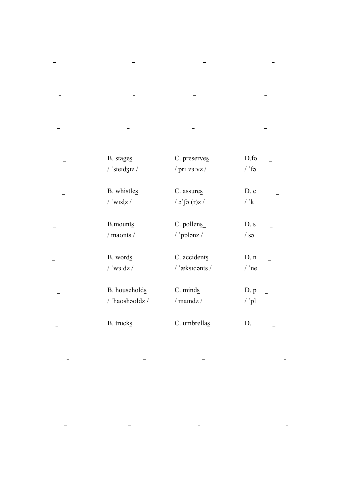 Chọn từ có phần gạch chân được phát âm khác so với các từ còn lại. Exercise 1: 1. A. proofs B. books C. points D. days 2. A. asks B. breathes C. breaths D. hopes 3 A. sees B. sports C. pools D. trains 4. A. tombs B. lamps C. brakes D. invites 5. A. books B. floors C. combs D. drums 6. A. cats B. tapes C. rides D. cooks 7. A. walks B. begins C. helps D. cuts 8. A. shoots B. grounds C. concentrates D. forests 9. A. helps B. laughs C. cooks D. finds 10. A. hours B. fathers C. dreams D. thinks Exercise 2: 1. A. beds B. doors C. plays D. students 2. A. arms B. suits C. chairs D. boards 3. A. boxes B. classes C. potatoes D. finishes 4. A. relieves B. invents C. buys D. deals 5. A. dreams B. heals C. kills D. tasks 6. A. resources B. stages C. preserves D.focuses 7. A. carriages B. whistles C. assures D. costumes 8. A. offers B.mounts C. pollens D. swords 9. A. miles B. words C. accidents D. names 10. A. sports B. households C. minds D. plays 11. A. pools B. trucks C. umbrellas D. workers 12. A. programs B. individuals C. subjects D. celebrations 13. A. houses B. horses C. matches D. wives 14. A. barracks B. series C. means D. headquarters 15. A. crossroads B. species C. works D. mosquitoes Đáp án Exercise 1: 1. A. proofs B. books C. points D. days / pruːfs / / bʊks / / pɔɪnts / / ˈdeɪz / Đáp án: D 2. A. asks B. breathes C. breaths D. hopes / ˈɑːsks / / briːðz / / breθs / / həʊps / Đáp án: B 3 A. sees B. sports C. pools D. trains / ˈsiːz / / spɔːts / / puːlz / / treɪnz / Đáp án: B 4. A. tombs B. lamps C. brakes D. invites / tuːmz / / læmps / / breɪks / / ɪnˈvaɪts / Đáp án: A 5. A. books B. floors C. combs D. drums / bʊks / / flɔː(r)z / / kəʊmz / / drʌmz / Đáp án: A 6. A. cats B. tapes C. rides D. cooks / kæts / / teɪps / / raɪdz / / kʊks / Đáp án: C 7. A. walks B. begins C. helps D. cuts / wɔːks / / bɪˈɡɪnz / / helps / / kʌts / Đáp án: B 8. A. shoots B. grounds C. concentrates D. forests / ʃuːts / / ɡraʊndz / / ˈkɒnsəntreɪts / / ˈfɒrɪsts / Đáp án: B 9. A. helps B. laughs C. cooks D. finds / helps / / lɑːfs / / kʊks / / faɪndz / Đáp án: D 10. A. hours B. fathers C. dreams D. thinks / ˈaʊə(r)z / / ˈfɑːðə(r)z / / driːmz / / ˈθɪŋks / Đáp án: D Exercise 2: 1. A. beds B. doors C. plays D. students / ˈbedz / / dɔː(r)z / / ˈpleɪz / / ˈstjuːdnts / Đáp án: D 2. A. arms B. suits C. chairs D. boards / ɑːmz / / suːts / / tʃeə(r)z / / bɔːdz / Đáp án: B 3. A. boxes B. classes C. potatoes D. finishes / ˈbɒksɪz / / ˈklɑːsɪz / / pəˈteɪtəʊz / / ˈfɪnɪʃɪz / Đáp án: C 4. A. relieves B. invents C. buys D. deals / rɪˈliːvz / / ɪnˈvents / / baɪz / / diːlz / Đáp án: B 5. A. dreams B. heals C. kills D. tasks / driːmz / / hiːlz / / kɪlz / / tɑːsks / Đáp án: D 6. A. resources B. stages C. preserves D.focuses / rɪˈzɔːsɪz / / ˈsteɪdʒɪz / / prɪˈzɜːvz / / ˈfəʊkəsɪz / Đáp án: C 7. A. carriages B. whistles C. assures D. costumes / ˈkærɪdʒɪz / / ˈwɪsl̩z / / əˈʃɔː(r)z / / ˈkɒstjuːmz / Đáp án: A 8. A. offers B.mounts C. pollens_ D. swords / ˈɒfə(r)z / / maʊnts / / ˈpɒlənz / / sɔːdz / Đáp án: B 9. A. miles B. words C. accidents D. names / maɪlz / / ˈwɜːdz / / ˈæksɪdənts / / ˈneɪmz / Đáp án: C 10. A. sports B. households C. minds D. plays / spɔːts / / ˈhaʊshəʊldz / / maɪndz / / ˈpleɪz / Đáp án: A 11. A. pools B. trucks C. umbrellas D. workers / puːlz / / trʌks / / ʌmˈbreləz / / ˈwɜːkə(r)z / Đáp án: B 12. A. programs B. individuals C. subjects D. celebrations / ˈprəʊɡræmz / / ˌɪndɪˈvɪdʒʊəlz / / səbˈdʒekts / / ˌselɪˈbreɪʃn̩z / Đáp án: C 13. A. houses B. horses C. matches D. wives / ˈhaʊzɪz / / ˈhɔːsɪz / / ˈmætʃɪz / / waɪvz / Đáp án: D 14. A. barracks^ B. series C. means D. headquarters / ˈbærəks / / ˈsɪəriːz / / miːnz / / hedˈkwɔːtəz / Đáp án: A 15. A. crossroads B. species C. works D. mosquitoes / ˈkrɒsrəʊdz / / ˈspiːʃiːz / / ˈwɜːks / / məˈskiːtəʊz / Đáp án: C