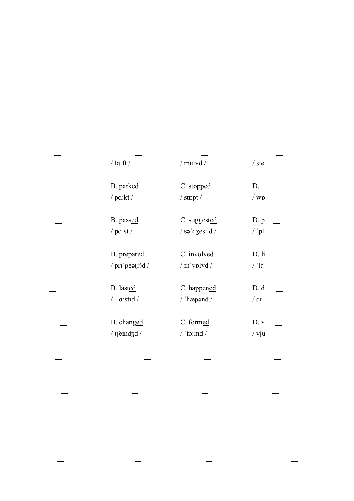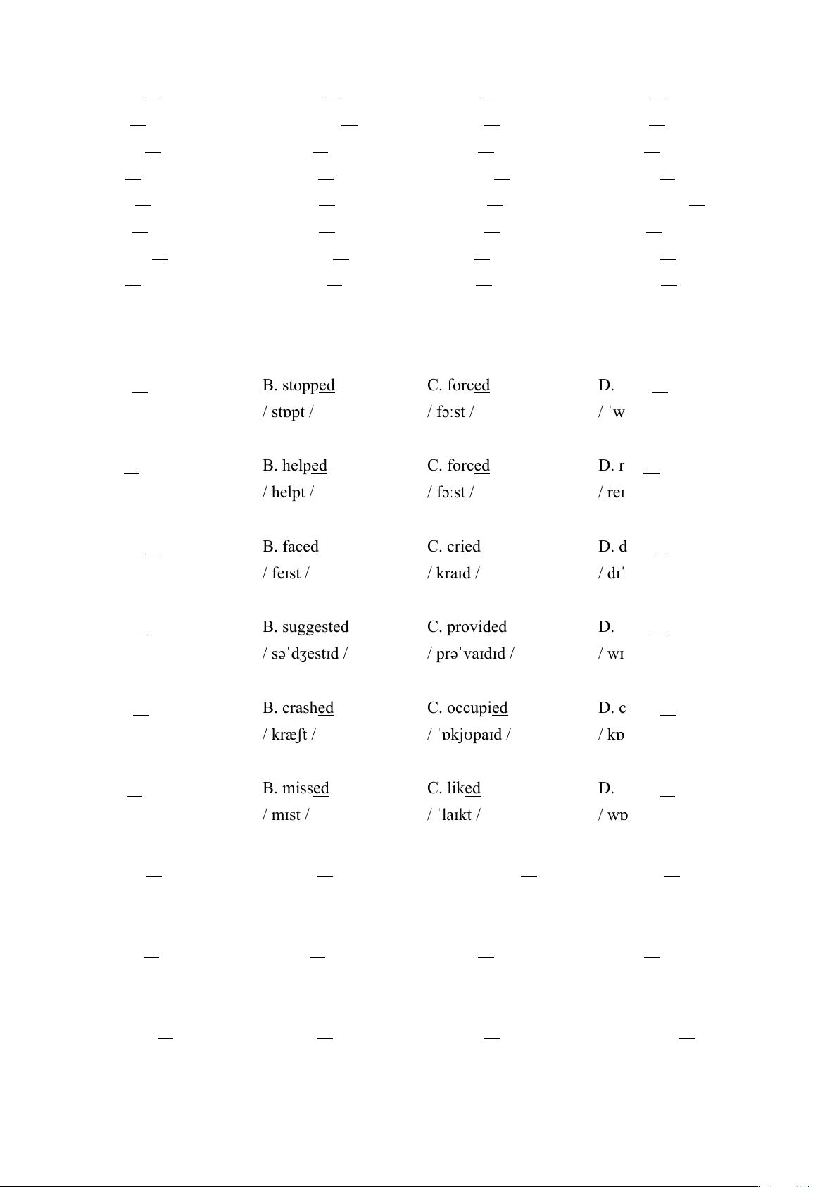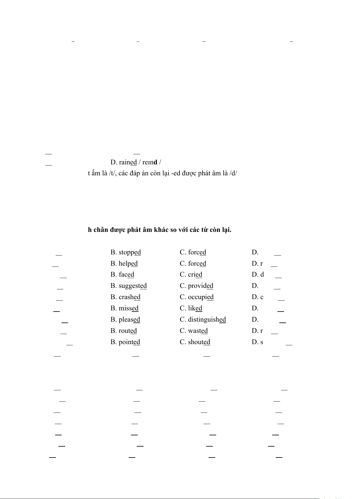 Chọn từ có phần gạch chân được phát âm khác so với các từ còn lại. Exercise 1: 1. A. worked B. stopped C. forced D. wanted 2. A. kissed B. helped C. forced D. raised 3. A. confused B. faced C. cried D. defined 4. A. devoted B. suggested C. provided D. wished 5. A. catched B. crashed C. occupied D. coughed 6. A. agreed B. missed C. liked D. watched 7. A. measured B. pleased C. distinguished D. managed 8. A. wounded B. routed C. wasted D. risked 9. A. imprisoned B. pointed C. shouted D. surrounded 10. A. failed B.reached C. absored D. solved Exercise 2: 1. A. invited B. attended C. celebrated D. displayed 2. A. removed B. washed C. hoped D. missed 3. A. looked B. laughed C. moved D. stepped 4. A. wanted B. parked C. stopped D. watched 5 A. laughed B. passed C. suggested D. placed 6. A. believed B. prepared C. involved D. liked 7. A. lifted B. lasted C. happened D. decided 8. A. collected B. changed C. formed D. viewed 9. A. walked B. entertained C. reached D. looked 10. A. admired B. looked C. missed D. hoped 11. A. filled B. cleaned C. ploughed D. watched 12. A. visited B. decided C. engaged D. disappointed 13. A. kissed B. stopped C. laughed D. closed 14. A. reformed B. appointed C. stayed D. installed 15. A. fitted B. educated C. locked D. intended Đáp án Exercise 1: 1. A. worked B. stopped C. forced D. wanted / ˈwɜːkt / / stɒpt / / fɔːst / / ˈwɒntɪd / Đáp án: D 2. A. kissed B. helped C. forced D. raised / kɪst / / helpt / / fɔːst / / reɪzd / Đáp án: D 3. A. confused B. faced C. cried D. defined / kənˈfjuːzd / / feɪst / / kraɪd / / dɪˈfaɪnd / Đáp án: B 4. A. devoted B. suggested C. provided D. wished / dɪˈvəʊtɪd / / səˈdʒestɪd / / prəˈvaɪdɪd / / wɪʃt / Đáp án: D 5. A. catched B. crashed C. occupied D. coughed / kætʃt / / kræʃt / / ˈɒkjʊpaɪd / / kɒft / Đáp án: C 6. A. agreed B. missed C. liked D. watched / əˈɡriːd / / mɪst / / ˈlaɪkt / / wɒtʃt / Đáp án: A 7. A. measured B. pleased C. distinguished D. managed / ˈmeʒə(r)d / / pliːzd / / dɪˈstɪŋɡwɪʃt / / ˈmænɪdʒd / Đáp án: C 8. A. wounded B. routed C. wasted D. risked / ˈwuːndɪd / / ˈruːtɪd / / ˈweɪstɪd / / rɪskt / Đáp án: D 9. A. imprisoned B. pointed C. shouted D. surrounded / ɪmˈprɪzn̩d / / ˈpɔɪntɪd / / ˈʃaʊtɪd / / səˈraʊndɪd / Đáp án: A 10. A. failed B.reached C. absored D. solved / feɪld / / riːtʃt / / absored / / sɒlvd / Đáp án: B Exercise 2: 1. A. invited B. attended C. celebrated D. displayed / ɪnˈvaɪtɪd / / əˈtendɪd / / ˈselɪbreɪtɪd / / dɪˈspleɪd / Đáp án: D 2. A. removed B. washed C. hoped D. missed / rɪˈmuːvd / / wɒʃt / / həʊpt / / mɪst / Đáp án: A 3. A. looked B. laughed C. moved D. stepped / ˈlʊkt / / lɑːft / / muːvd / / stept / Đáp án: C 4. A. wanted B. parked C. stopped D. watched / ˈwɒntɪd / / pɑːkt / / stɒpt / / wɒtʃt / Đáp án: A 5 A. laughed B. passed C. suggested D. placed / lɑːft / / pɑːst / / səˈdʒestɪd / / ˈpleɪst / Đáp án: C 6. A. believed B. prepared C. involved D. liked / bɪˈliːvd / / prɪˈpeə(r)d / / ɪnˈvɒlvd / / ˈlaɪkt / Đáp án: D 7. A. lifted B. lasted C. happened D. decided / ˈlɪftɪd / / ˈlɑːstɪd / / ˈhæpənd / / dɪˈsaɪdɪd / Đáp án: C 8. A. collected B. changed C. formed D. viewed / kəˈlektɪd / / tʃeɪndʒd / / ˈfɔːmd / / vjuːd / Đáp án: A 9. A. walked B. entertained C. reached D. looked / ˈwɔːkt / / ˌentəˈteɪnd / / riːtʃt / / ˈlʊkt / Đáp án: B 10. A. admired B. looked C. missed D. hoped / ədˈmaɪə(r)d / / ˈlʊkt / / mɪst / / həʊpt / Đáp án: A 11. A. filled B. cleaned C. ploughed D. watched / fɪld / / kliːnd / / plaʊd / / wɒtʃt / Đáp án: D 12. A. visited B. decided C. engaged D. disappointed / ˈvɪzɪtɪd / / dɪˈsaɪdɪd / / ɪnˈɡeɪdʒd / / ˌdɪsəˈpoɪntɪd / Đáp án: C 13. A. kissed B. stopped C. laughed D. closed / kɪst / / stɒpt / / lɑːft / / kləʊzd / Đáp án: D 14. A. reformed B. appointed C. stayed D. installed / rɪˈfɔːmd / / əˈpɔɪntɪd / / steɪd / / ɪnˈstɔːld / Đáp án: B 15. A. fitted B. educated C. locked D. intended / ˈfɪtɪd / / ˈedʒʊkeɪtɪd / / lɒkt / / ɪnˈtendɪd / Đáp án: C