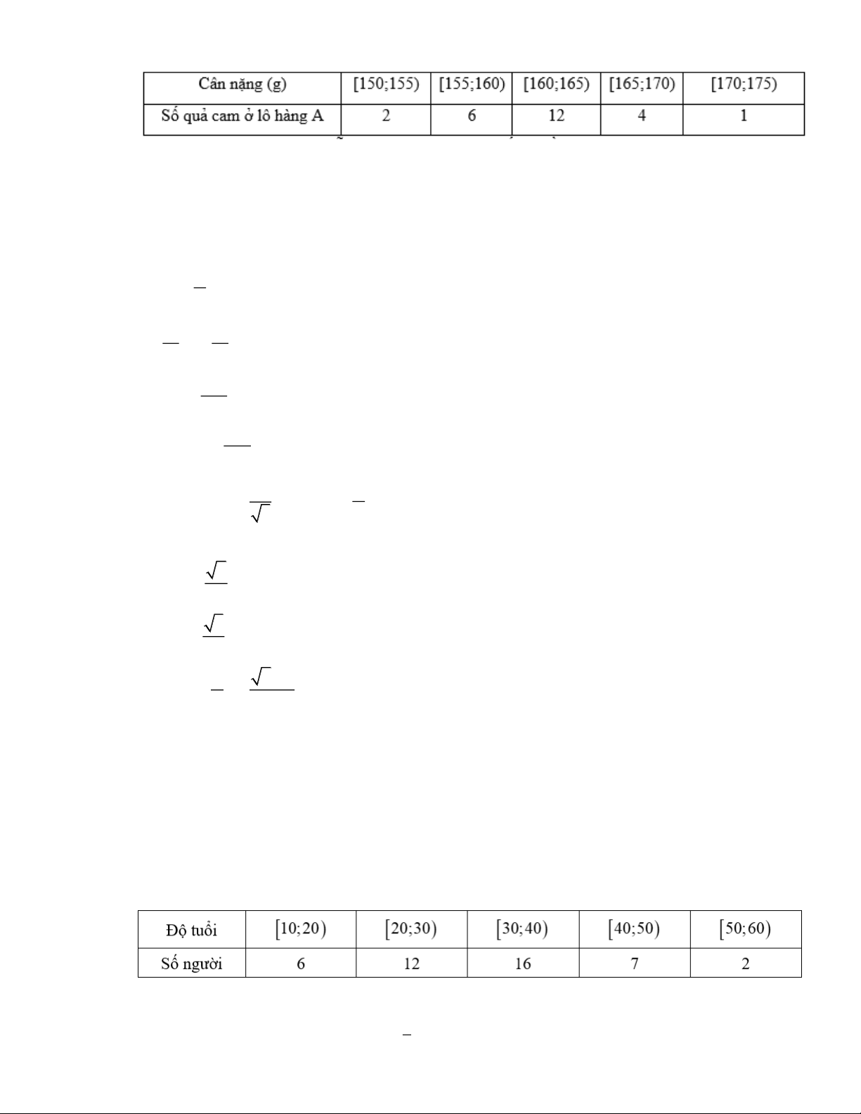 Câu 12: Kết quả khảo sát cân nặng của 25 quả cam ở lô hàng A được cho ở bảng sau: Trang 13