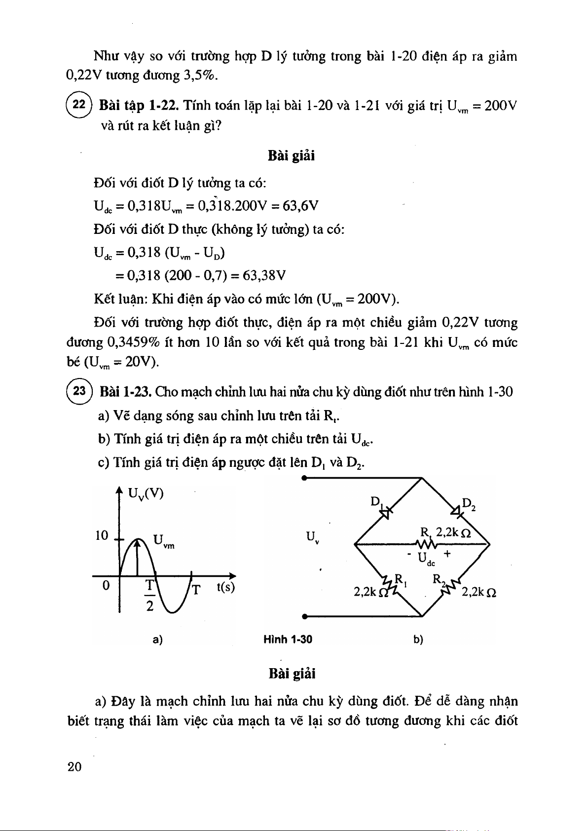 (^2^ Bài 1-23. Cho mạch chỉnh lưu hai nửa chu kỳ dừig điốt như trên hình 1-30