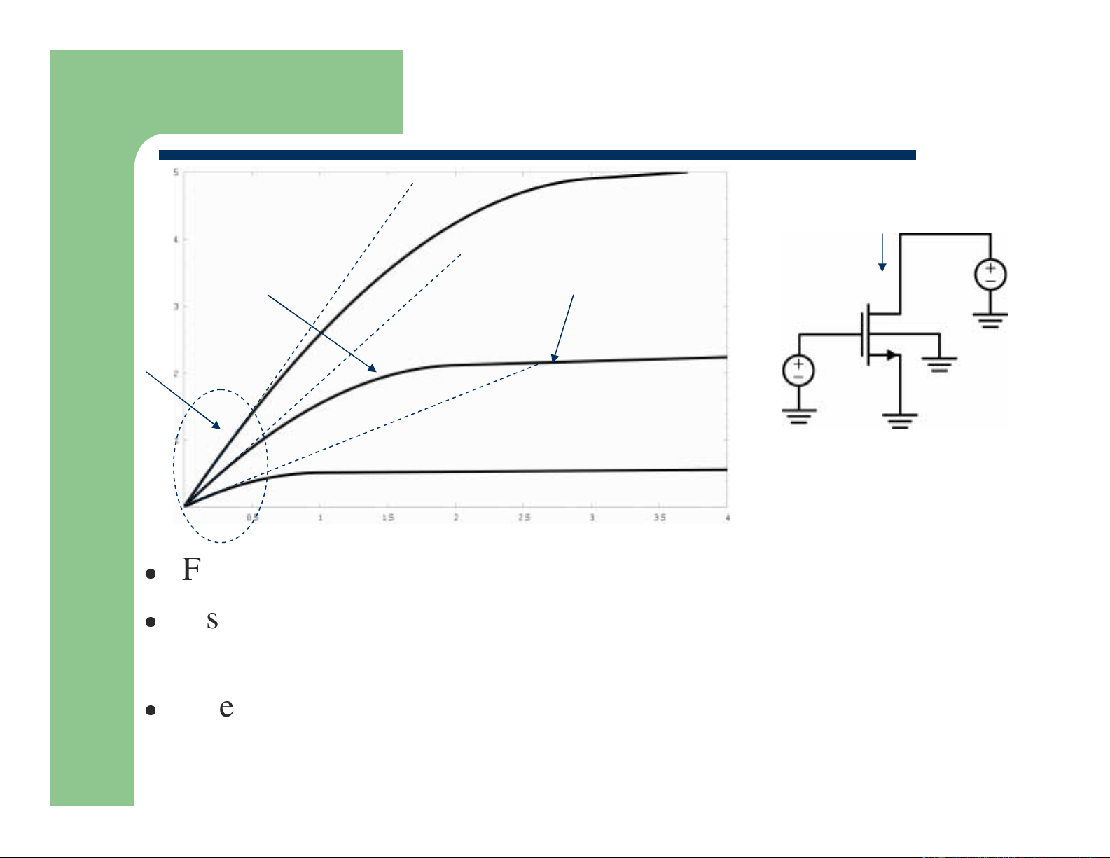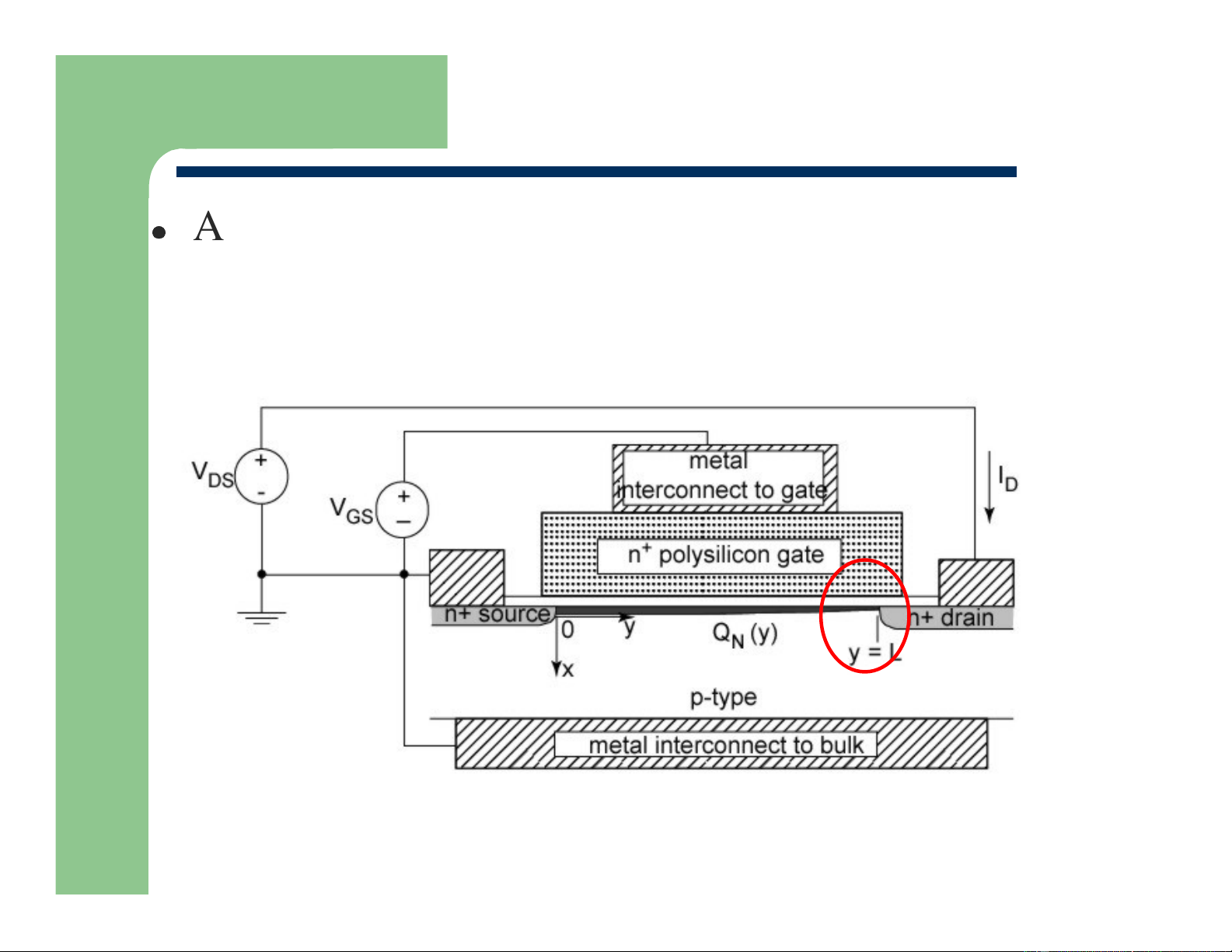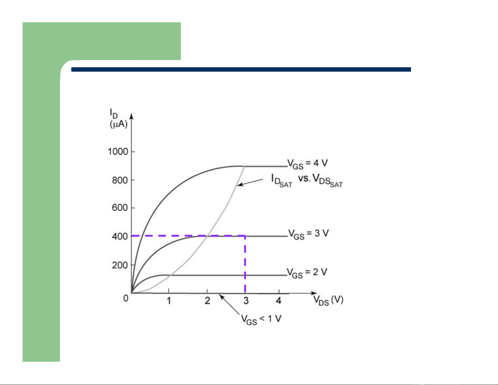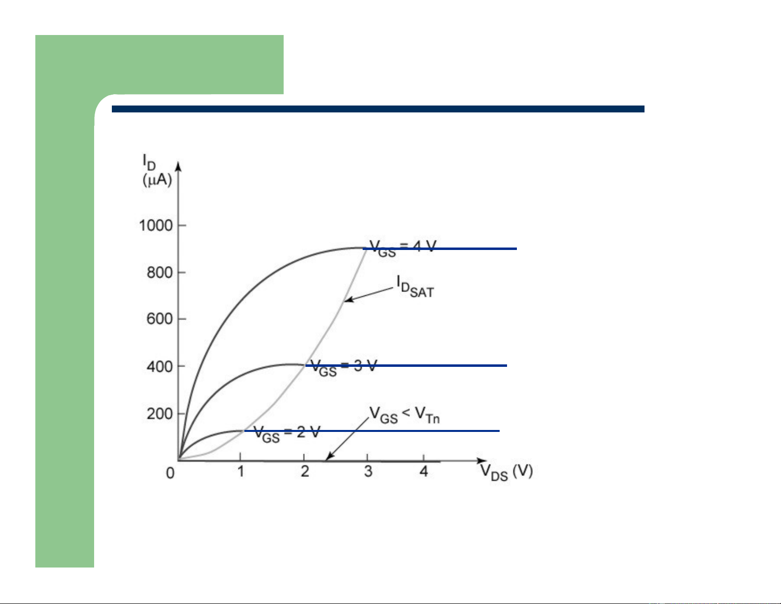 Current stays at maximum (where V = V – V = V ) DS GS Tn DS,SAT W V I = µC ( DS V −V − )V D ox GS T L 2 DS W V V I µ − = C ( GS T V −V − )(V −V ) DS ,sat ox GS T L 2 GS T W µCox 2 I = (V −V ) DS ,sat L 2 GS T