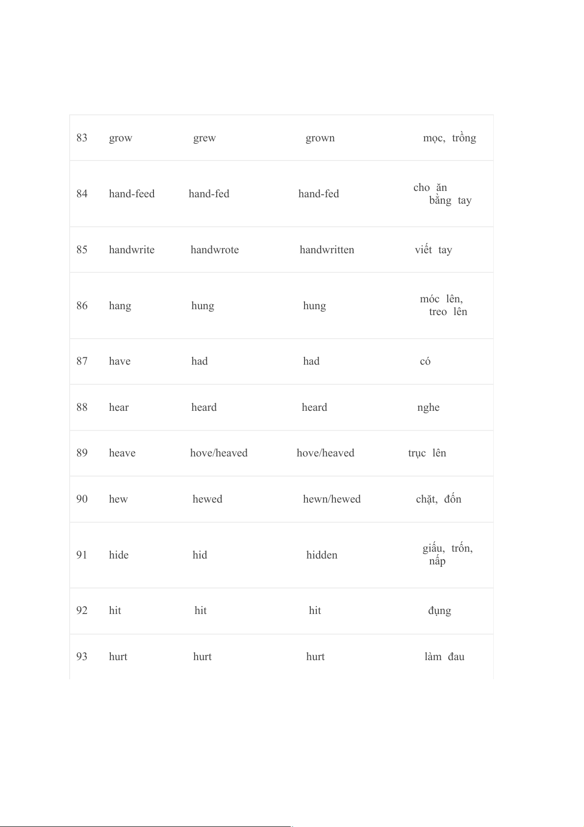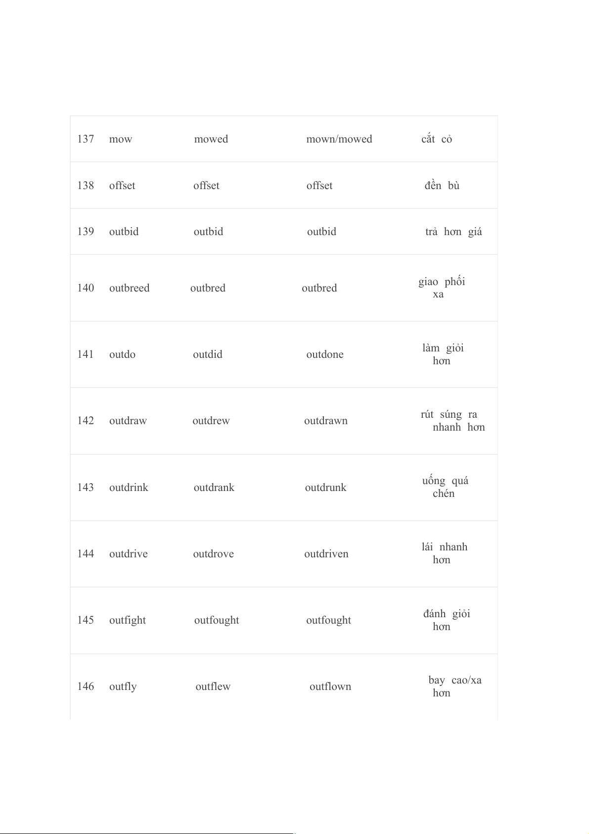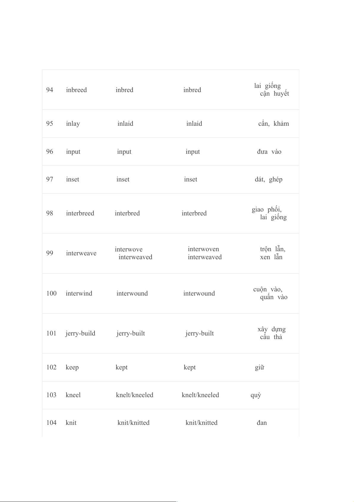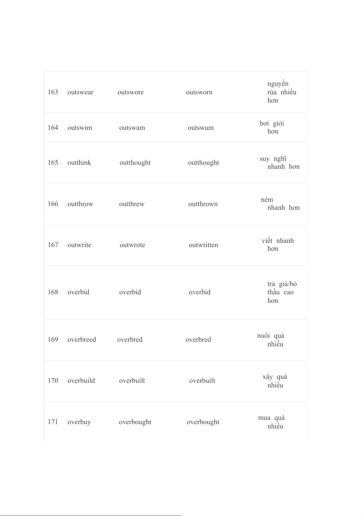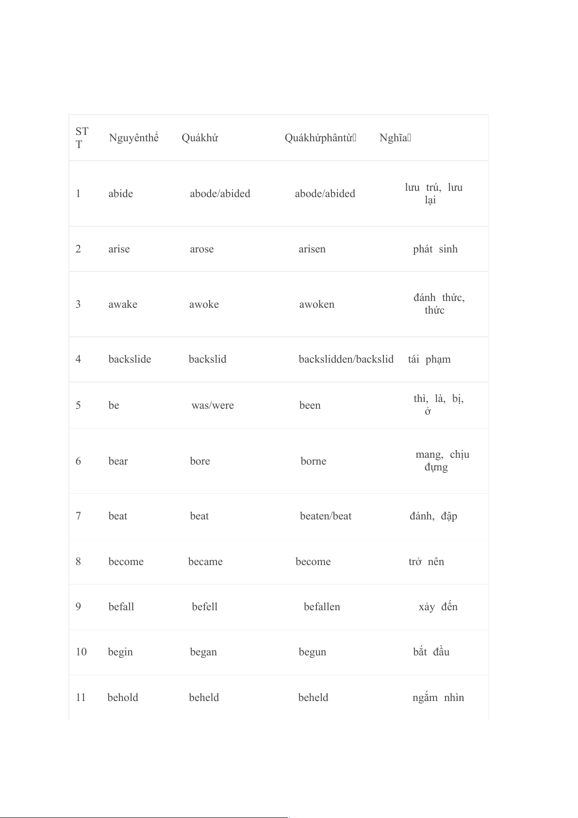 Quá khứ phân từ Nghĩa lưu trú, lưu 1 abide abode/abided abode/abided lại 2 arise arose arisen phát sinh đánh thức, 3 awake awoke awoken thức 4 backslide backslid backslidden/backslid tái phạm thì, là, bị, 5 be was/were been ở mang, chịu 6 bear bore borne đựng 7 beat beat beaten/beat đánh, đập 8 become became become trở nên 9 befall befell befallen xảy đến 10 begin began begun bắt đầu 11 behold beheld beheld ngắm nhìn 12 bend bent bent bẻ cong 13 beset beset beset bao quanh 14 bespeak bespoke bespoken chứng tỏ đánh 15 bet bet/betted bet/betted cược, cá cược 16 bid bid bid trả giá 17 bind bound bound buộc, trói 18 bite bit bitten cắn 19 bleed bled bled chảy máu 20 blow blew blown thổi 21 break broke broken đập vỡ nuôi, dạy 22 breed bred bred dỗ 23 bring brought brought mang đến 24 broadcast broadcast broadcast phát thanh browbeaten/ 25 browbeat browbeat hăm dọa browbeat 26 build built built xây dựng 27 burn burnt/burned burnt/burned đốt, cháy nổ tung, 28 burst burst burst vỡ òa làm bể, 29 bust busted/bust busted/bust làm vỡ 30 buy bought bought mua 31 cast cast cast ném, tung 32 catch caught caught bắt, chụp mắng, 33 chide chid/chided chid/chidden/chided chửi 34 choose chose chosen chọn, lựa chẻ, tách 35 cleave clove/cleft/cleaved cloven/cleft/cleaved hai 36 cleave clave cleaved dính chặt bám vào, 37 cling clung clung dính vào 38 clothe clothed/clad clothed/clad che phủ 39 come came come đến, đi đến 40 cost cost cost có giá là bò, trườn, 41 creep crept crept lẻn cho lai 42 crossbreed crossbred crossbred giống 43 crow crew/crewed crowed gáy (gà) 44 cut cut cut cắt, chặt nghĩ vẩn daydreamed daydreamed 45 daydream vơ, mơ daydreamt daydreamt mộng 46 deal dealt dealt giao thiệp 47 dig dug dug đào 48 disprove disproved disproved/disproven bác bỏ lặn, lao 49 dive dove/dived dived xuống 50 do did done làm 51 draw drew drawn vẽ, kéo 52 dream dreamt/dreamed dreamt/dreamed mơ thấy 53 drink drank drunk uống 54 drive drove driven lái xe 55 dwell dwelt dwelt trú ngụ, ở 56 eat ate eaten ăn 57 fall fell fallen ngã, rơi cho ăn, ăn, 58 feed fed fed nuôi 59 feel felt felt cảm thấy 60 fight fought fought chiến đấu tìm thấy, 61 find found found thấy làm cho 62 fit fitted/fit fitted/fit vừa, làm cho hợp 63 flee fled fled chạy trốn tung, 64 fling flung flung quăng 65 fly flew flown bay 66 forbear forbore forborne nhịn cấm, cấm 67 forbid forbade/forbad forbidden đoán 68 forecast forecast/forecasted forecast/forecasted tiên đoán forego (also 69 forewent foregone bỏ, kiêng forgo) 70 foresee foresaw forseen thấy trước 71 foretell foretold foretold đoán trước 72 forget forgot forgotten quên 73 forgive forgave forgiven tha thứ 74 forsake forsook forsaken ruồng bỏ (làm) đông 75 freeze froze frozen lại 76 frostbite frostbit frostbitten bỏng lạnh 77 get got got/gotten có được 78 gild gilt/gilded gilt/gilded mạ vàng 79 gird girt/girded girt/girded đeo vào 80 give gave given cho 81 go went gone đi nghiền, 82 grind ground ground xay 83 grow grew grown mọc, trồng cho ăn 84 hand-feed hand-fed hand-fed bằng tay 85 handwrite handwrote handwritten viết tay móc lên, 86 hang hung hung treo lên 87 have had had có 88 hear heard heard nghe 89 heave hove/heaved hove/heaved trục lên 90 hew hewed hewn/hewed chặt, đốn giấu, trốn, 91 hide hid hidden nấp 92 hit hit hit đụng 93 hurt hurt hurt làm đau lai giống 94 inbreed inbred inbred cận huyết 95 inlay inlaid inlaid cẩn, khảm 96 input input input đưa vào 97 inset inset inset dát, ghép giao phối, 98 interbreed interbred interbred lai giống interwove interwoven trộn lẫn, 99 interweave interweaved interweaved xen lẫn cuộn vào, 100 interwind interwound interwound quấn vào xây dựng 101 jerry-build jerry-built jerry-built cẩu thả 102 keep kept kept giữ 103 kneel knelt/kneeled knelt/kneeled quỳ 104 knit knit/knitted knit/knitted đan biết, quen 105 know knew known biết 106 lay laid laid đặt, để dẫn dắt, 107 lead led led lãnh đạo 108 lean leaned/leant leaned/leant dựa, tựa nhảy, nhảy 109 leap leapt leapt qua học, được 110 learn learnt/learned learnt/learned biết 111 leave left left ra đi, để lại 112 lend lent lent cho mượn cho phép, 113 let let let để cho 114 lie lay lain nằm 115 light lit/lighted lit/lighted thắp sáng mấp máy 116 lip-read lip-read lip-read môi làm mất, 117 lose lost lost mất chế tạo, 118 make made made sản xuất 119 mean meant meant có nghĩa là 120 meet met met gặp mặt chọn vai 121 miscast miscast miscast đóng không hợp chia lộn 122 misdeal misdealt misdealt bài, chia bài sai 123 misdo misdid misdone phạm lỗi nghe 124 mishear misheard misheard nhầm 125 mislay mislaid mislaid để lạc mất làm lạc 126 mislead misled misled đường mislearned mislearned 127 mislearn mislearnt học nhầm mislearnt 128 misread misread misread đọc sai 129 misset misset misset đặt sai chỗ 130 misspeak misspoke misspoken nói sai viết sai 131 misspell misspelt misspelt chính tả tiêu phí, bỏ 132 misspend misspent misspent phí phạm lỗi, 133 mistake mistook mistaken lầm lẫn 134 misteach mistaught mistaught dạy sai misunderstan 135 misunderstood misunderstood hiểu lầm d 136 miswrite miswrote miswritten viết sai 137 mow mowed mown/mowed cắt cỏ 138 offset offset offset đền bù 139 outbid outbid outbid trả hơn giá giao phối 140 outbreed outbred outbred xa làm giỏi 141 outdo outdid outdone hơn rút súng ra 142 outdraw outdrew outdrawn nhanh hơn uống quá 143 outdrink outdrank outdrunk chén lái nhanh 144 outdrive outdrove outdriven hơn đánh giỏi 145 outfight outfought outfought hơn bay cao/xa 146 ou