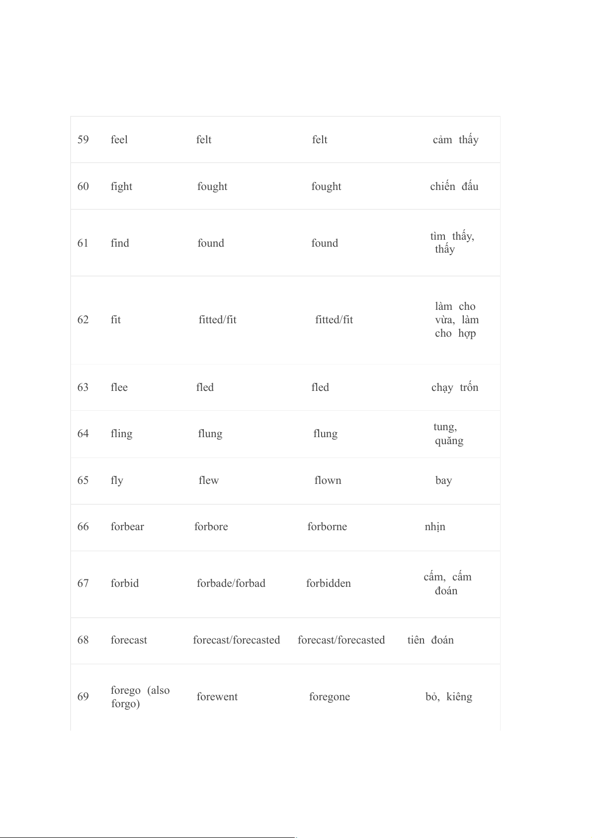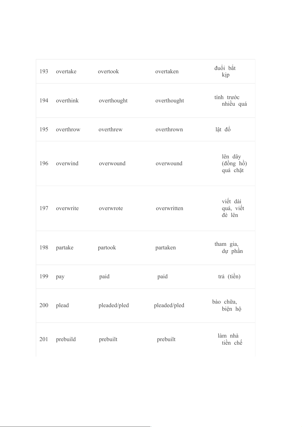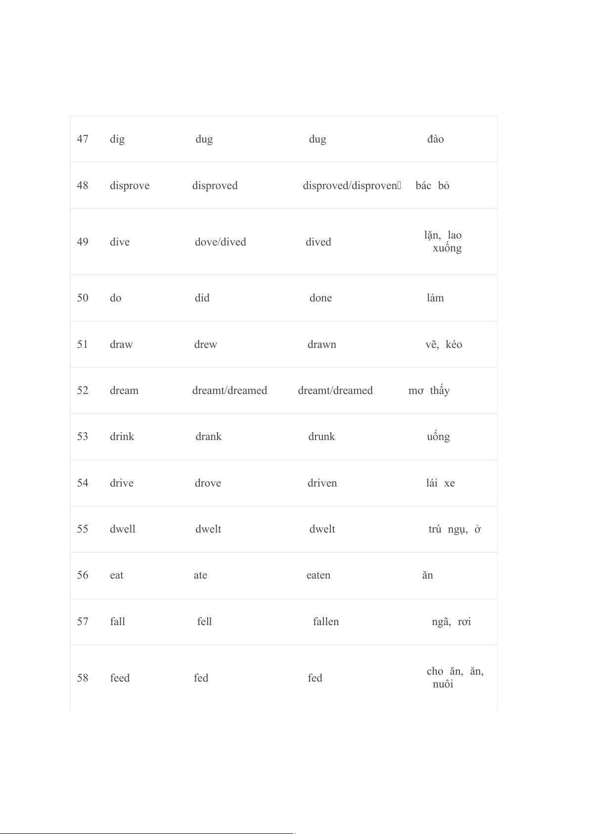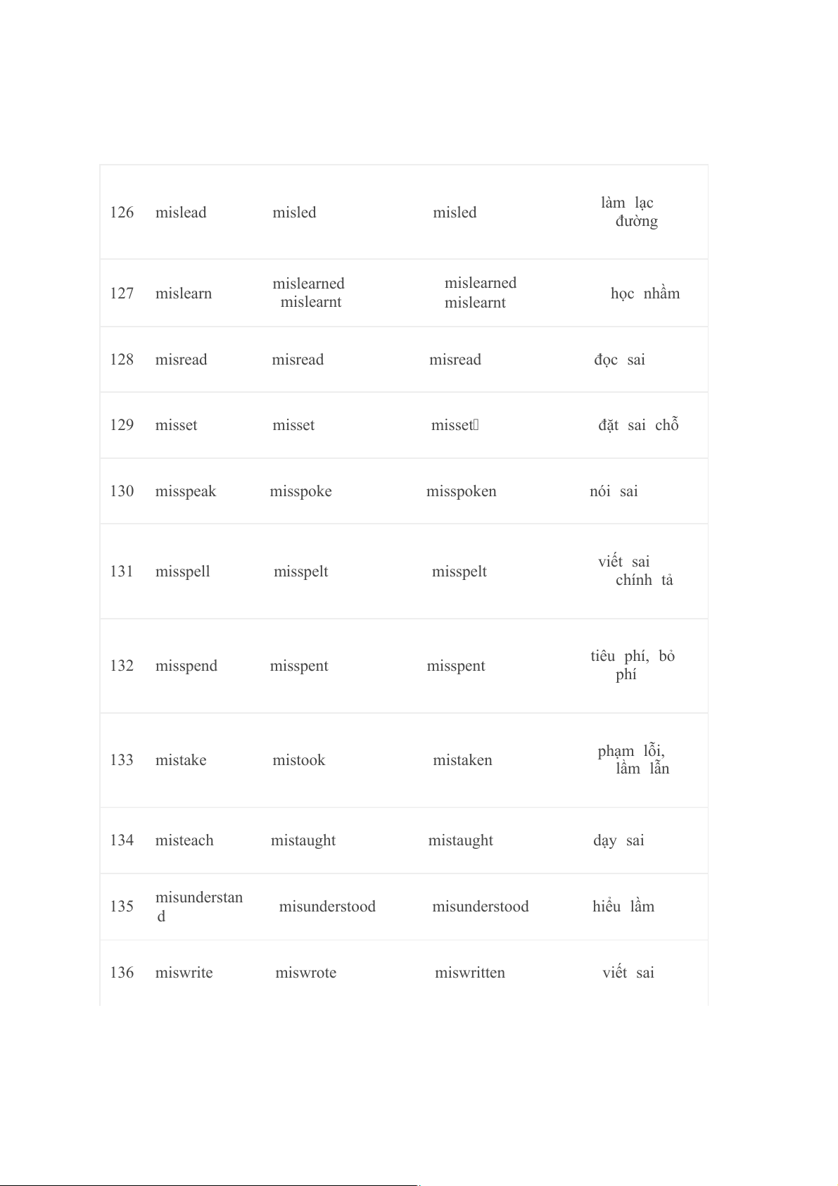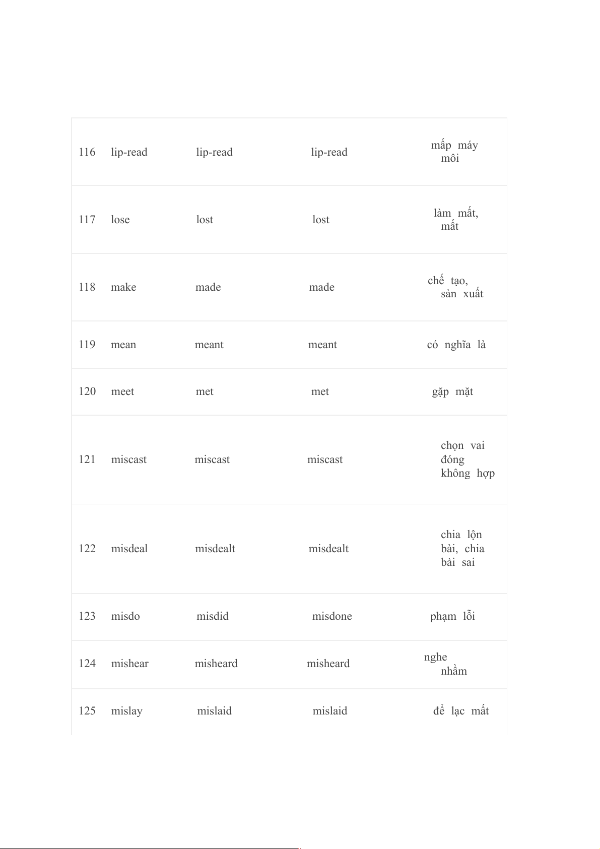 Quá khứ phân từ Nghĩa lưu trú, lưu 1 abide abode/abided abode/abided lại 2 arise arose arisen phát sinh đánh thức, 3 awake awoke awoken thức 4 backslide backslid backslidden/backslid tái phạm thì, là, bị, 5 be was/were been ở mang, chịu 6 bear bore borne đựng 7 beat beat beaten/beat đánh, đập 8 become became become trở nên 9 befall befell befallen xảy đến 10 begin began begun bắt đầu 11 behold beheld beheld ngắm nhìn 12 bend bent bent bẻ cong 13 beset beset beset bao quanh 14 bespeak bespoke bespoken chứng tỏ đánh 15 bet bet/betted bet/betted cược, cá cược 16 bid bid bid trả giá 17 bind bound bound buộc, trói 18 bite bit bitten cắn 19 bleed bled bled chảy máu 20 blow blew blown thổi 21 break broke broken đập vỡ nuôi, dạy 22 breed bred bred dỗ 23 bring brought brought mang đến 24 broadcast broadcast broadcast phát thanh browbeaten/ 25 browbeat browbeat hăm dọa browbeat 26 build built built xây dựng 27 burn burnt/burned burnt/burned đốt, cháy nổ tung, 28 burst burst burst vỡ òa làm bể, 29 bust busted/bust busted/bust làm vỡ 30 buy bought bought mua 31 cast cast cast ném, tung 32 catch caught caught bắt, chụp mắng, 33 chide chid/chided chid/chidden/chided chửi 34 choose chose chosen chọn, lựa chẻ, tách 35 cleave clove/cleft/cleaved cloven/cleft/cleaved hai 36 cleave clave cleaved dính chặt bám vào, 37 cling clung clung dính vào 38 clothe clothed/clad clothed/clad che phủ 39 come came come đến, đi đến 40 cost cost cost có giá là bò, trườn, 41 creep crept crept lẻn cho lai 42 crossbreed crossbred crossbred giống 43 crow crew/crewed crowed gáy (gà) 44 cut cut cut cắt, chặt nghĩ vẩn daydreamed daydreamed 45 daydream vơ, mơ daydreamt daydreamt mộng 46 deal dealt dealt giao thiệp 47 dig dug dug đào 48 disprove disproved disproved/disproven bác bỏ lặn, lao 49 dive dove/dived dived xuống 50 do did done làm 51 draw drew drawn vẽ, kéo 52 dream dreamt/dreamed dreamt/dreamed mơ thấy 53 drink drank drunk uống 54 drive drove driven lái xe 55 dwell dwelt dwelt trú ngụ, ở 56 eat ate eaten ăn 57 fall fell fallen ngã, rơi cho ăn, ăn, 58 feed fed fed nuôi 59 feel felt felt cảm thấy 60 fight fought fought chiến đấu tìm thấy, 61 find found found thấy làm cho 62 fit fitted/fit fitted/fit vừa, làm cho hợp 63 flee fled fled chạy trốn tung, 64 fling flung flung quăng 65 fly flew flown bay 66 forbear forbore forborne nhịn cấm, cấm 67 forbid forbade/forbad forbidden đoán 68 forecast forecast/forecasted forecast/forecasted tiên đoán forego (also 69 forewent foregone bỏ, kiêng forgo) 70 foresee foresaw forseen thấy trước 71 foretell foretold foretold đoán trước 72 forget forgot forgotten quên 73 forgive forgave forgiven tha thứ 74 forsake forsook forsaken ruồng bỏ (làm) đông 75 freeze froze frozen lại 76 frostbite frostbit frostbitten bỏng lạnh 77 get got got/gotten có được 78 gild gilt/gilded gilt/gilded mạ vàng 79 gird girt/girded girt/girded đeo vào 80 give gave given cho 81 go went gone đi nghiền, 82 grind ground ground xay 83 grow grew grown mọc, trồng cho ăn 84 hand-feed hand-fed hand-fed bằng tay 85 handwrite handwrote handwritten viết tay móc lên, 86 hang hung hung treo lên 87 have had had có 88 hear heard heard nghe 89 heave hove/heaved hove/heaved trục lên 90 hew hewed hewn/hewed chặt, đốn giấu, trốn, 91 hide hid hidden nấp 92 hit hit hit đụng 93 hurt hurt hurt làm đau lai giống 94 inbreed inbred inbred cận huyết 95 inlay inlaid inlaid cẩn, khảm 96 input input input đưa vào 97 inset inset inset dát, ghép giao phối, 98 interbreed interbred interbred lai giống interwove interwoven trộn lẫn, 99 interweave interweaved interweaved xen lẫn cuộn vào, 100 interwind interwound interwound quấn vào xây dựng 101 jerry-build jerry-built jerry-built cẩu thả 102 keep kept kept giữ 103 kneel knelt/kneeled knelt/kneeled quỳ 104 knit knit/knitted knit/knitted đan biết, quen 105 know knew known biết 106 lay laid laid đặt, để dẫn dắt, 107 lead led led lãnh đạo 108 lean leaned/leant leaned/leant dựa, tựa nhảy, nhảy 109 leap leapt leapt qua học, được 110 learn learnt/learned learnt/learned biết 111 leave left left ra đi, để lại 112 lend lent lent cho mượn cho phép, 113 let let let để cho 114 lie lay lain nằm 115 light lit/lighted lit/lighted thắp sáng mấp máy 116 lip-read lip-read lip-read môi làm mất, 117 lose lost lost mất chế tạo, 118 make made made sản xuất 119 mean meant meant có nghĩa là 120 meet met met gặp mặt chọn vai 121 miscast miscast miscast đóng không hợp chia lộn 122 misdeal misdealt misdealt bài, chia bài sai 123 misdo misdid misdone phạm lỗi nghe 124 mishear misheard misheard nhầm 125 mislay mislaid mislaid để lạc mất làm lạc 126 mislead misled misled đường mislearned mislearned 127 mislearn mislearnt học nhầm mislearnt 128 misread misread misread đọc sai 129 misset misset misset đặt sai chỗ 130 misspeak misspoke misspoken nói sai viết sai 131 misspell misspelt misspelt chính tả tiêu phí, bỏ 132 misspend misspent misspent phí phạm lỗi, 133 mistake mistook mistaken lầm lẫn 134 misteach mistaught mistaught dạy sai misunderstan 135 misunderstood misunderstood hiểu lầm d 136 miswrite miswrote miswritten viết sai 137 mow mowed mown/mowed cắt cỏ 138 offset offset offset đền bù 139 outbid outbid outbid trả hơn giá giao phối 140 outbreed outbred outbred xa làm giỏi 141 outdo outdid outdone hơn rút súng ra 142 outdraw outdrew outdrawn nhanh hơn uống quá 143 outdrink outdrank outdrunk chén lái nhanh 144 outdrive outdrove outdriven hơn đánh giỏi 145 outfight outfought outfought hơn bay cao/xa 146 ou