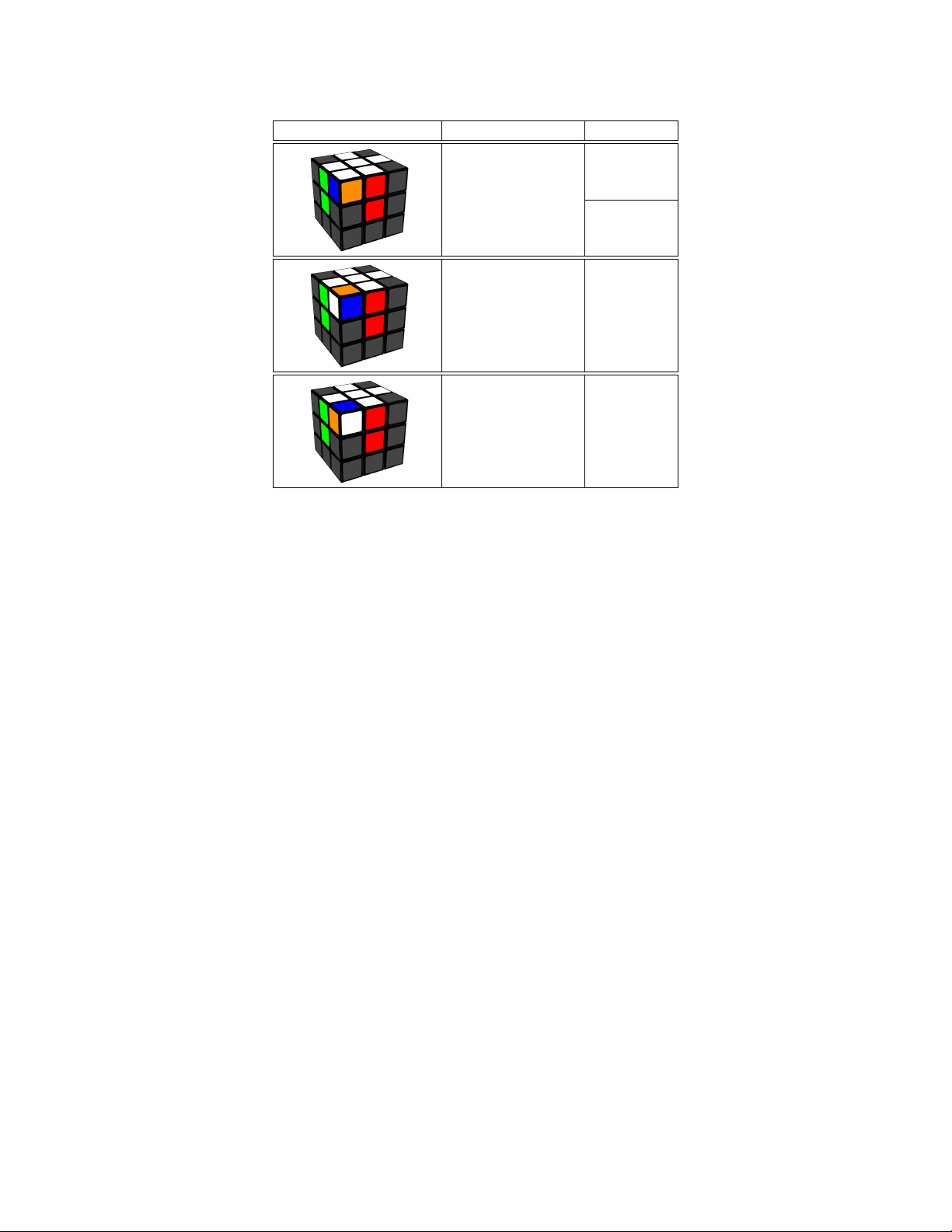 Table 4: Algorithms of the 2nd part to orientate the right upper corner (badly positioned) Figure Description Algorithms 1st option R’D’R Incorrect position; white on the top. 2nd option R’DR Incorrect position; white on the right. R’D’R Incorrect position; R’DR white in the front.