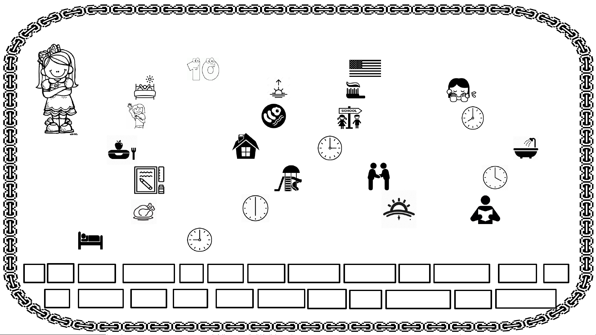 o'clock in the …............ .. .. .. . . I …........... .. .. a book. I ….......... . to bed at …........... .. .. o'clock . go ten have The USA go three meet morning wake up four breakfast home get six shower brush eight nine evening wash read playground lunch homework