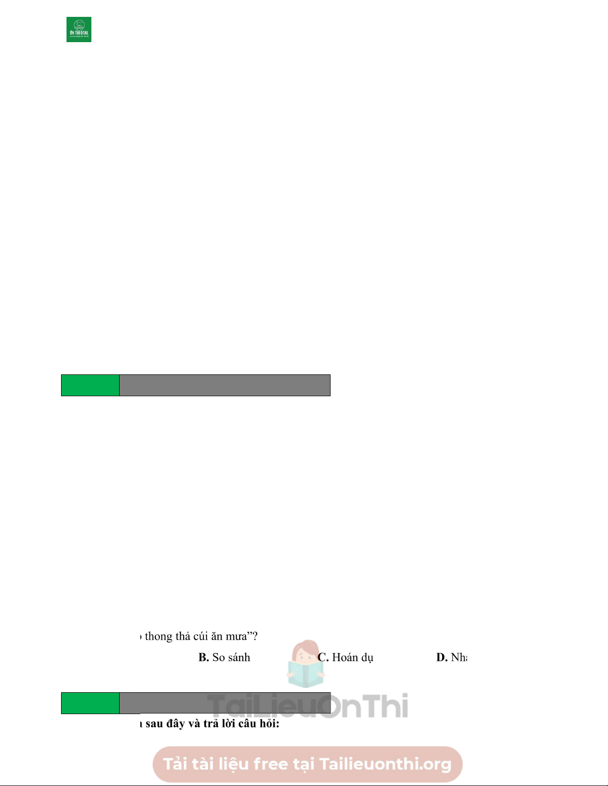 Câu văn nào trong đoạn trích trên không sử dụng biện pháp tu từ nhân hóa? A. Câu (1). B. Câu (2). C. Câu (4). D. Câu (6). Câu 52 Tailieuchuan.vn
