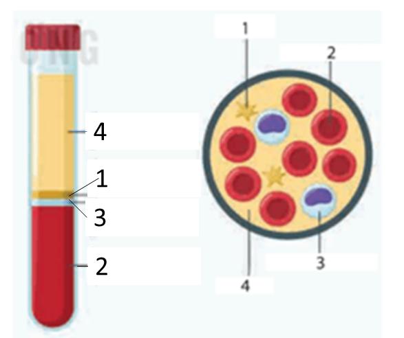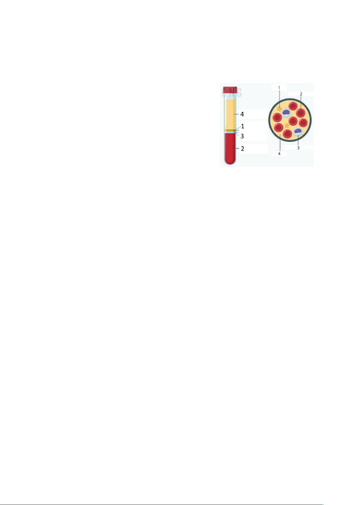 1. Xác định tên và chức năng các thành phần của máu được đánh số trong hình dưới. 2. Có 4 lọ đựng 4 nhóm máu A, B, AB và O của người. Nhưng 3 lọ bị mất nhãn, chỉ còn 1 lọ có nhãn ghi nhóm máu A. Dựa vào hiểu biết về nhóm máu em hãy tìm 3 nhóm máu đựng trong 3 lọ bị mất nhãn ở trên ? (Giả thiết cho rằng có đầy đủ dụng cụ để tiến hành các phép thử). |