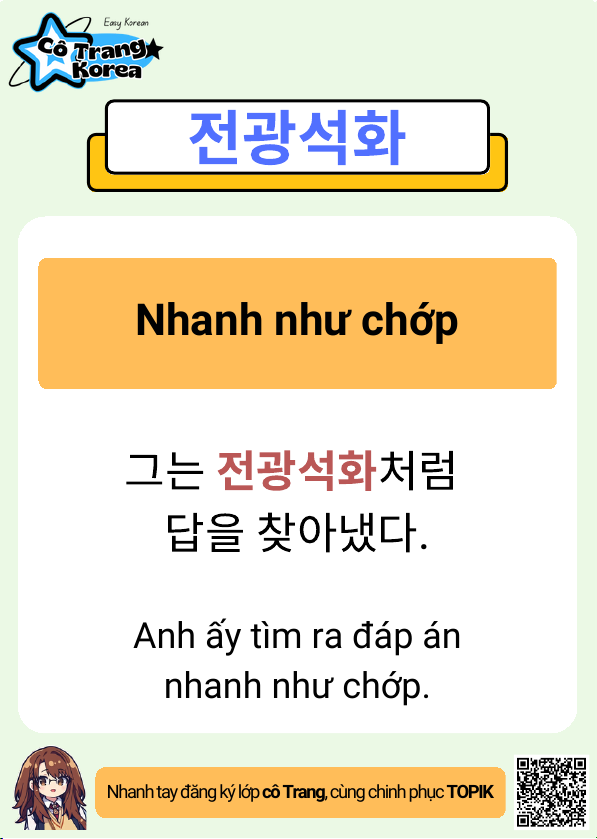 Nhanh tay đăng ký lớp cô Trang, cùng chinh phục TOPIK 전광석화 Nhanh như chớp 그는 그 는 전광 전 석 광 화 석 처럼 처 답을 답 을 찾아 찾 냈 아 다 냈 . 다 Anh ấy tìm ra đáp án nhanh như chớp.