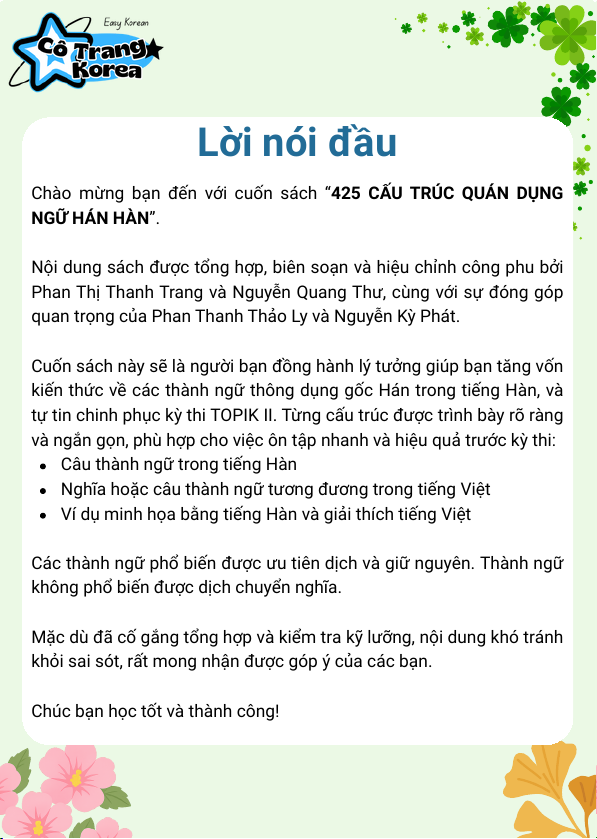 Chào mừng bạn đến với cuốn sách “425 CẤU TRÚC QUÁN DỤNG NGỮ HÁN HÀN”.