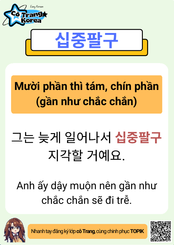 (gần như chắc chắn) 그는 그 는 늦게 늦 게 일어 일 나 어 서 나 서 십중 십 팔 중 구 팔 지각 지 할 각 할 거예 거 요 예 . 요