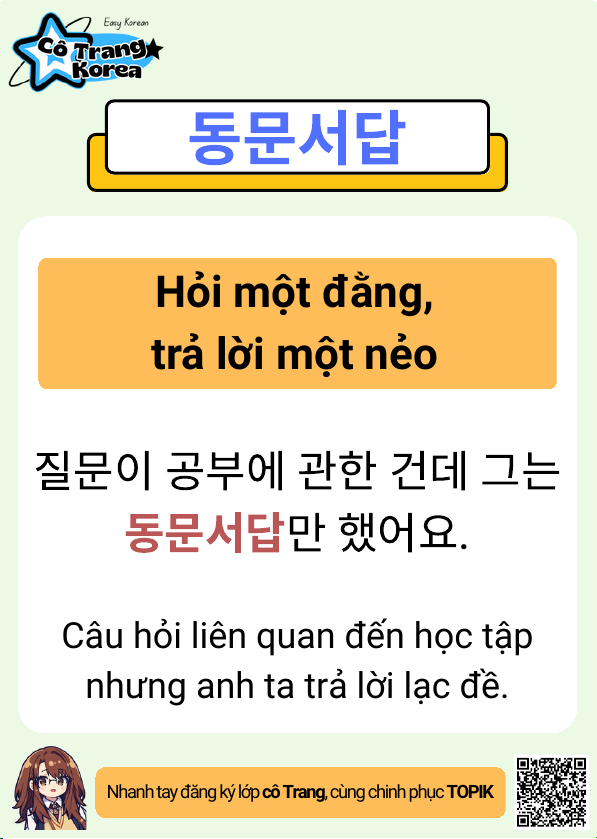 Nhanh tay đăng ký lớp cô Trang, cùng chinh phục TOPIK 동문서답 Hỏi một đằng, trả lời một nẻo 질문 질 이 문 이 공부 공 에 부 에 관한 관 한 건데 건 데 그는 그 동문 동 서 문 답 서 만 만 했어 했 요 어 . 요