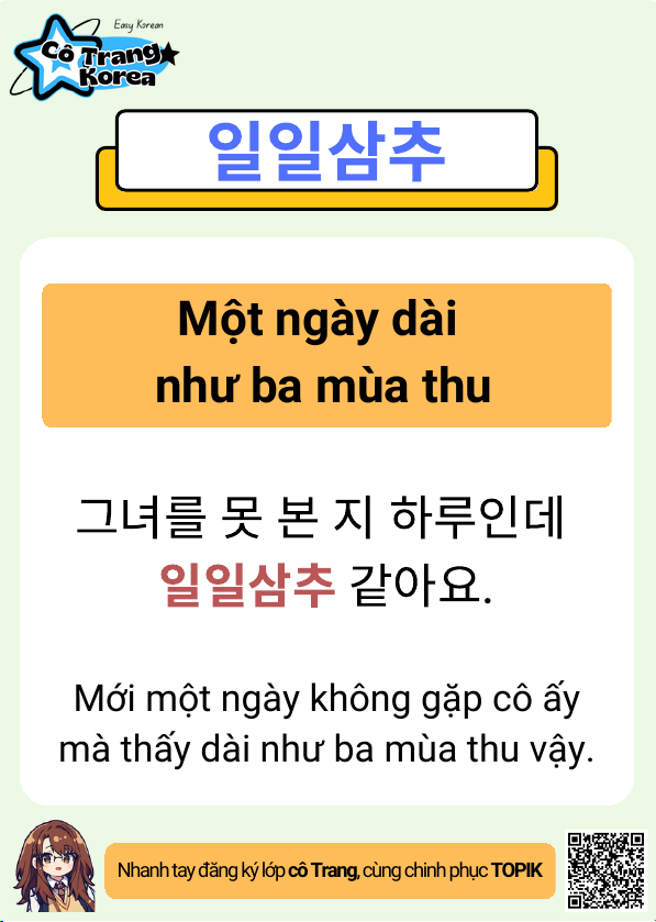Nhanh tay đăng ký lớp cô Trang, cùng chinh phục TOPIK 일일삼추 Một ngày dài như ba mùa thu 그녀 그 를 녀 를 못 못 본 본 지 지 하루 하 인 루 데 인 일일 일 삼 일 추 삼 같아 같 요 아 . 요
