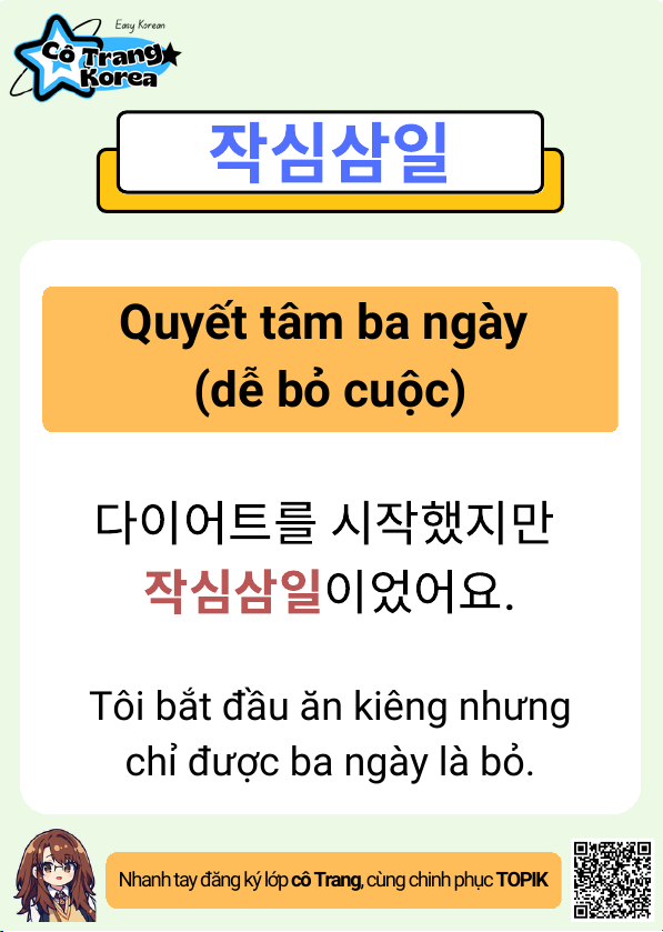 Nhanh tay đăng ký lớp cô Trang, cùng chinh phục TOPIK 작심삼일 Quyết tâm ba ngày (dễ bỏ cuộc) 다이 다 어 이 트 어 를 트 를 시작 시 했 작 지 했 만 지 작심 작 삼 심 일 삼 이었 이 어 었 요 어 . 요