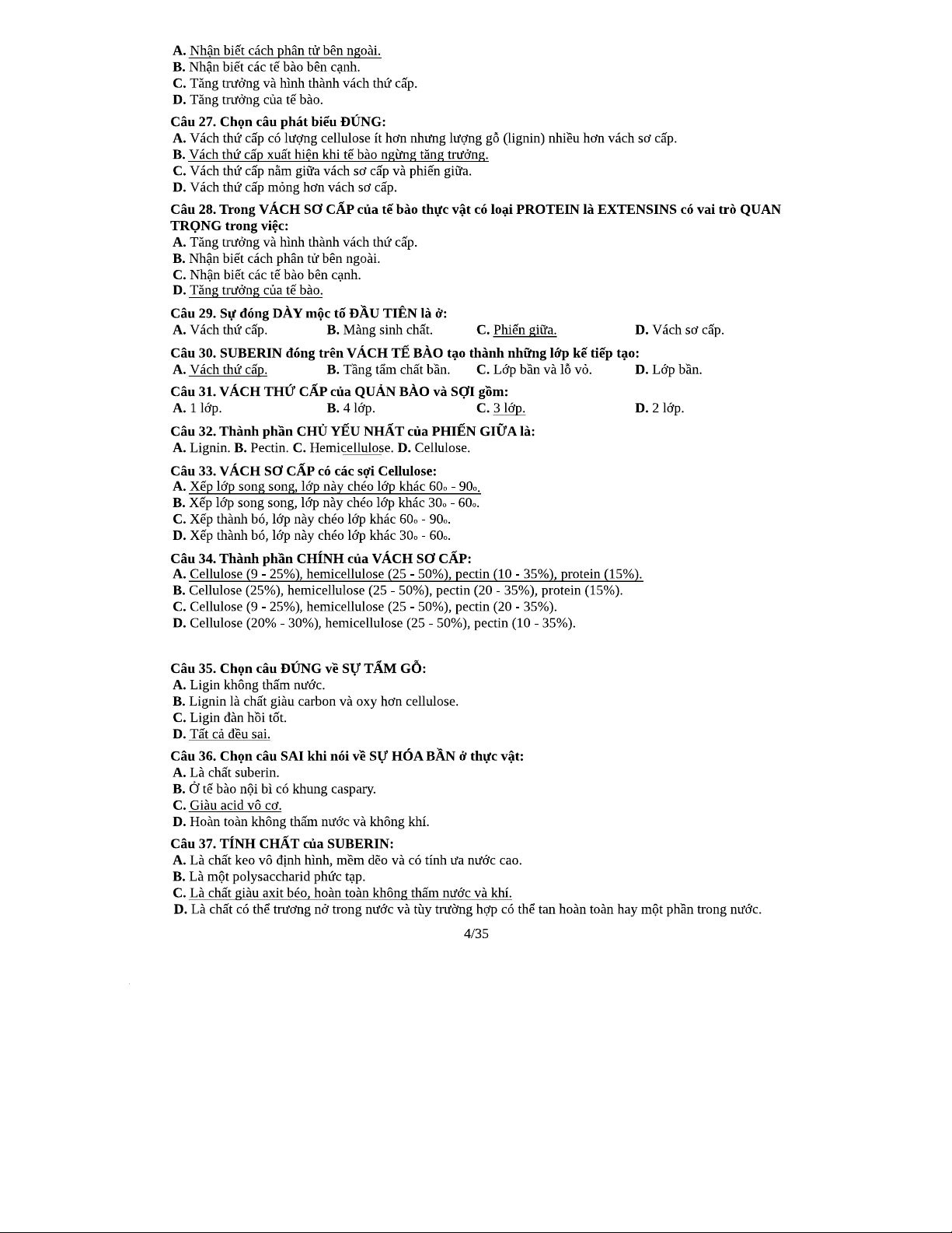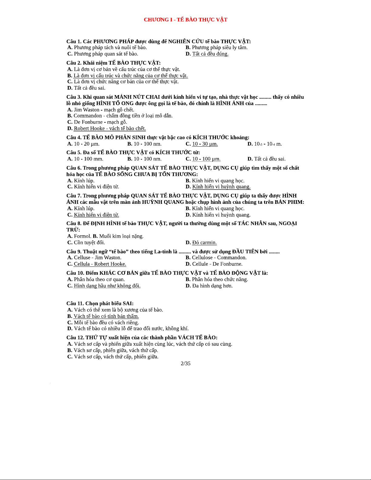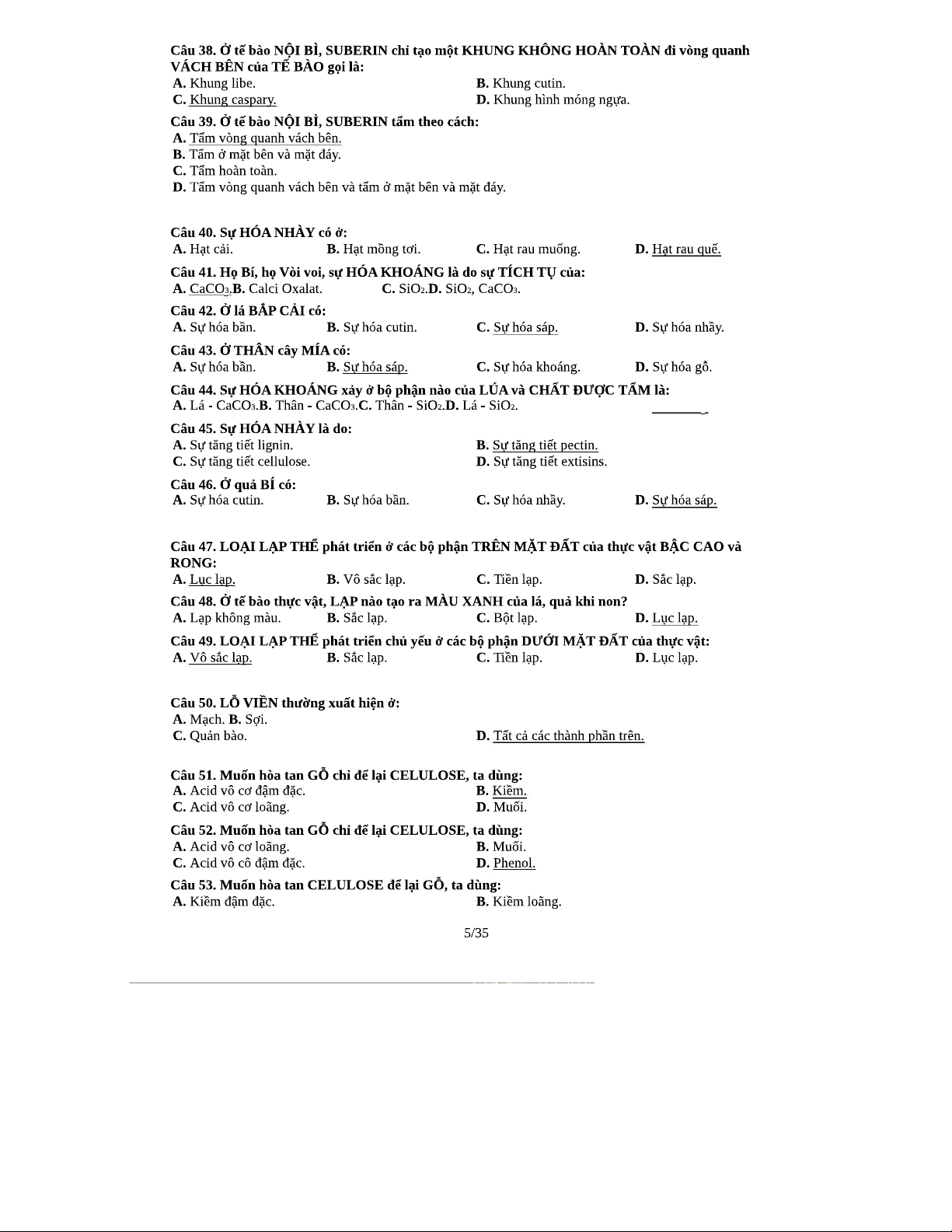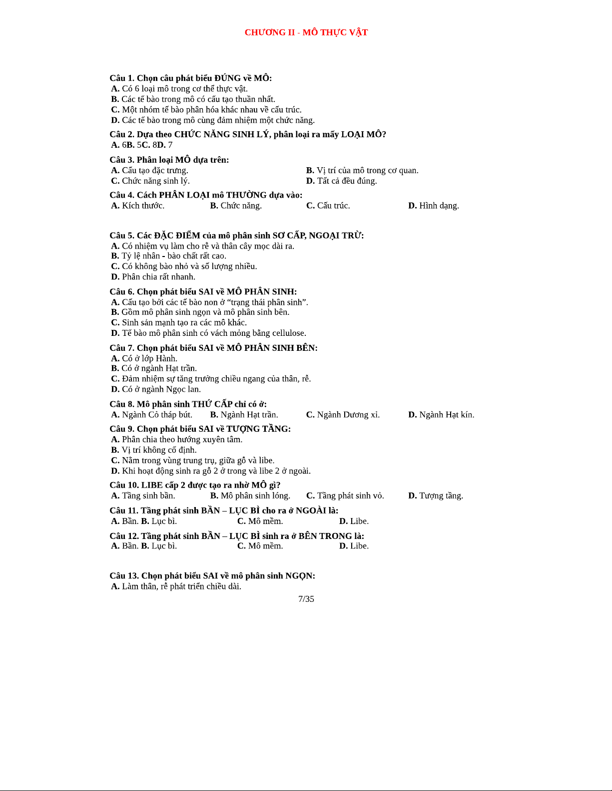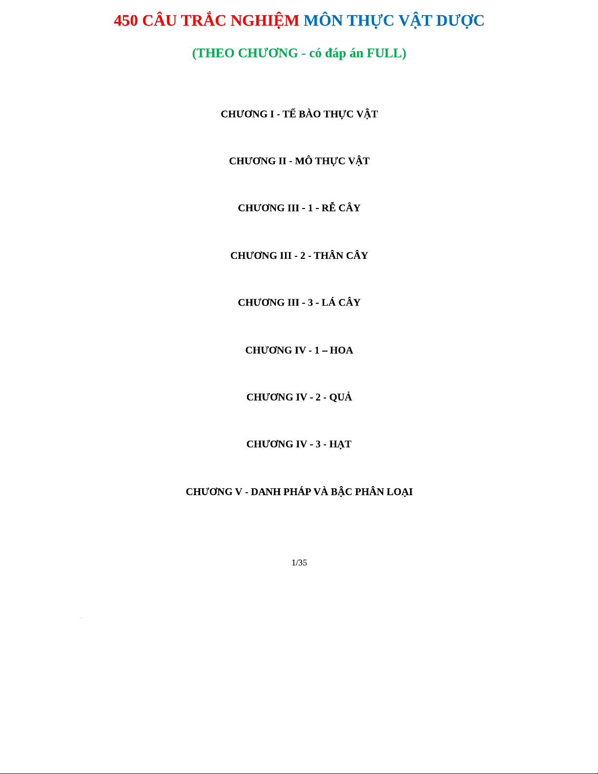 450 Câu Trắc Nghiệm Thực Vật Dược - Đáp Án Chi Tiết Theo Chương