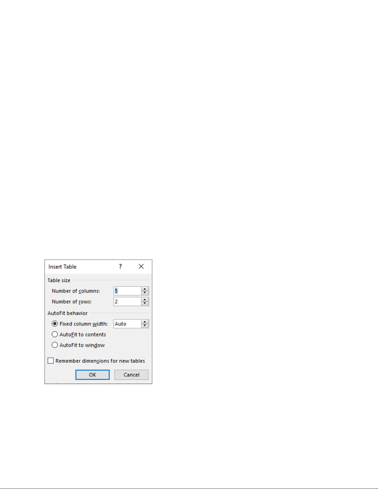 Để chèn một bảng mới lên tài liệu, mở mục chọn: Table | Insert | Table… Hộp thoại Insert Table xuất hiện: Hãy điền thông tin về cấu trúc bảng mới lên hộp thoại này: Mục Table size: cho phép thiết lập số cột (Columns) và số dòng (Rows) cho bảng: Gõ số cột của bảng vào mục: Number of columns: Gõ số dòng của bảng vào mục Number of rows: Mục AutoFit behavior: thiết lập một số các thuộc tính tự động căn chỉnh: Fixed column with: sẽ cố định chiều rộng của mỗi cột là: Auto – tự động căn chỉnh chiểu rộng cho cột; hoặc bạn gõ vào độ rộng của mỗi cột vào mục này (tốt nhất chọn Auto, vì bạn có thể căn chỉnh độ rộng của các cột sau này);AutoFit contents: tự động điều chỉnh độ rộng các cột khít với dữ liệu trong cột ấy; AutoFit window: tự động điều chỉnh độ rộng các cột trong bảng sao cho bảng có chiều rộng vừa khít chiều rộng trang văn bản.