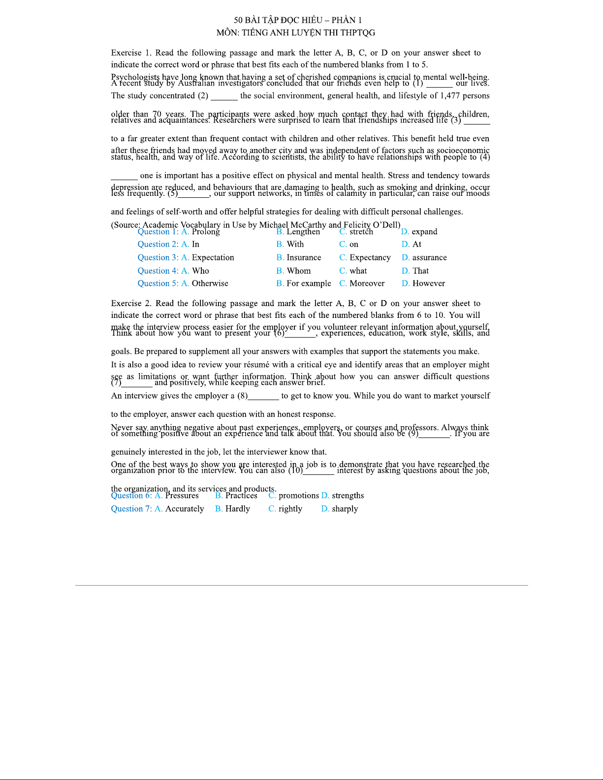 50 BÀI TẬP ĐỌC HIỂU – TIẾNG ANH LUYỆN THI THPTQG (PHẦN 1)