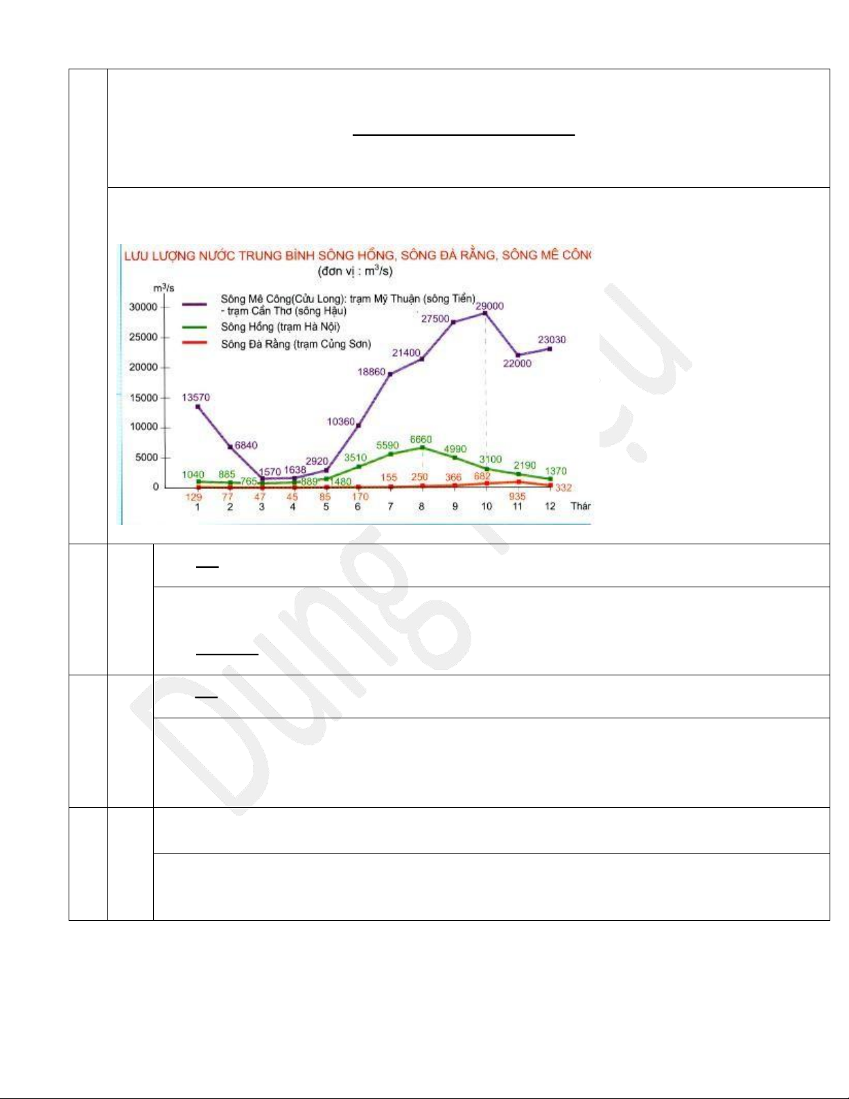 VD: Mùa lũ của sông Hồng kéo dài từ tháng mây đến tháng mấy? Hướngdẫn - Lưu lượng nước trung bình của sông Hồng là: 2705,75 (m3/s) - Các tháng mùa lũ: kéo