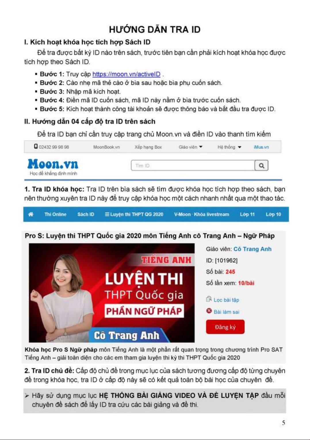 3. Tra ID Bài giảng hoặc Bài luyện tập: Vào trong cuốn sách, mỗi một bài học hoặc một
