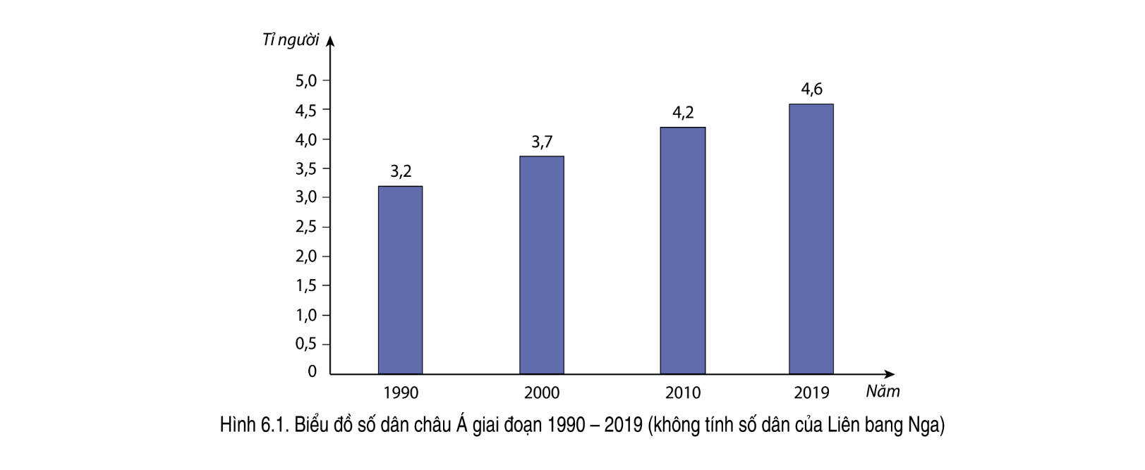 Nhận định nào sau đây đúng về số dân châu Á giai đoạn 1990 – 2019 (không tính số dân Liên Bang Nga)?