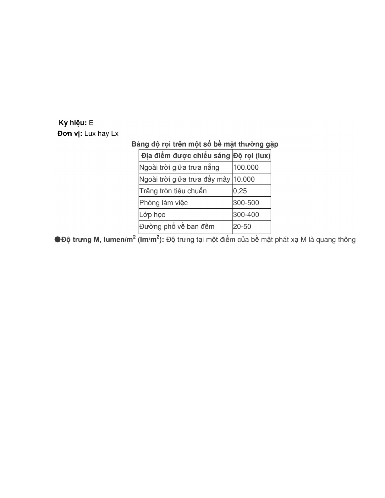 o ộ trưng ánh sáng: lumen/m2 (lm/m2).