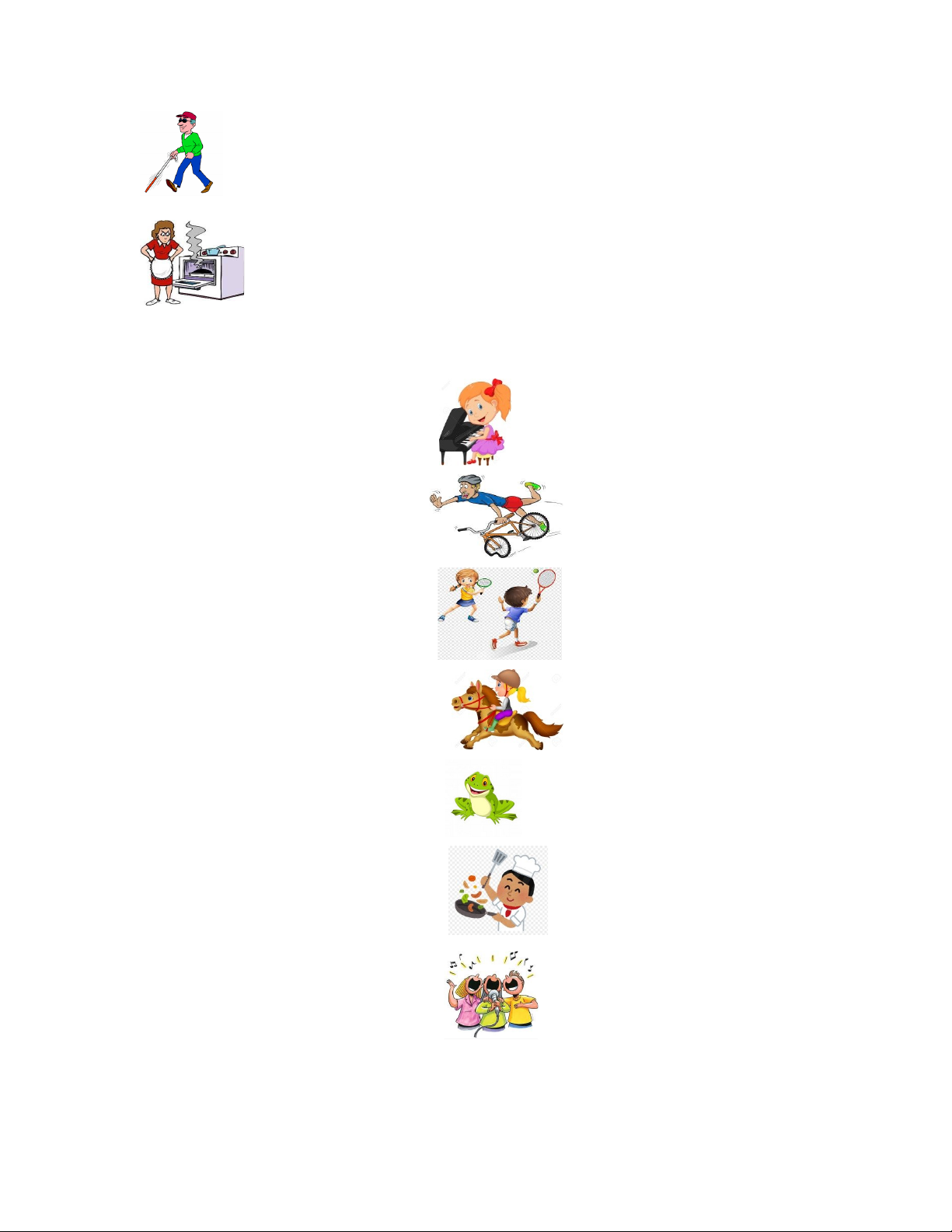 dance, cook, play tennis, jump, write ride a bike, sing, ride a horse, play the piano |