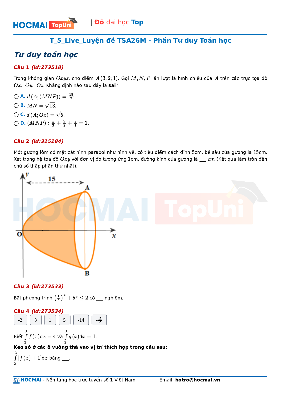 T_5_Live_Luyện đề TSA26M - Phần Tư duy Toán học Tư duy toán học Câu 1 (id:273518) Trong không gian Oxy ,