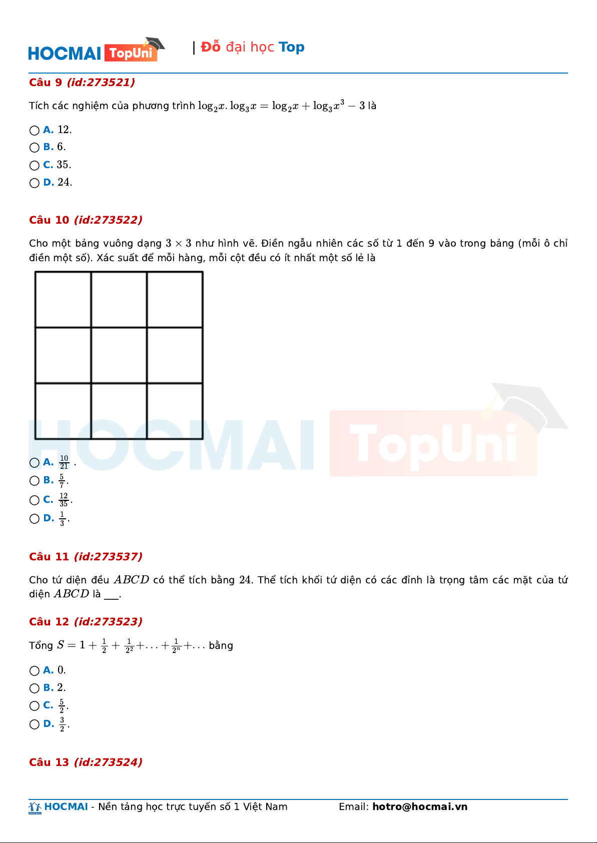 2x. log3x = log2x + log3x3 − 3 ◯ A. 1 . 2 ◯ B. . 6 ◯ C. 3 . 5 ◯ D. 2 . 4 Câu 10 (id:273522)