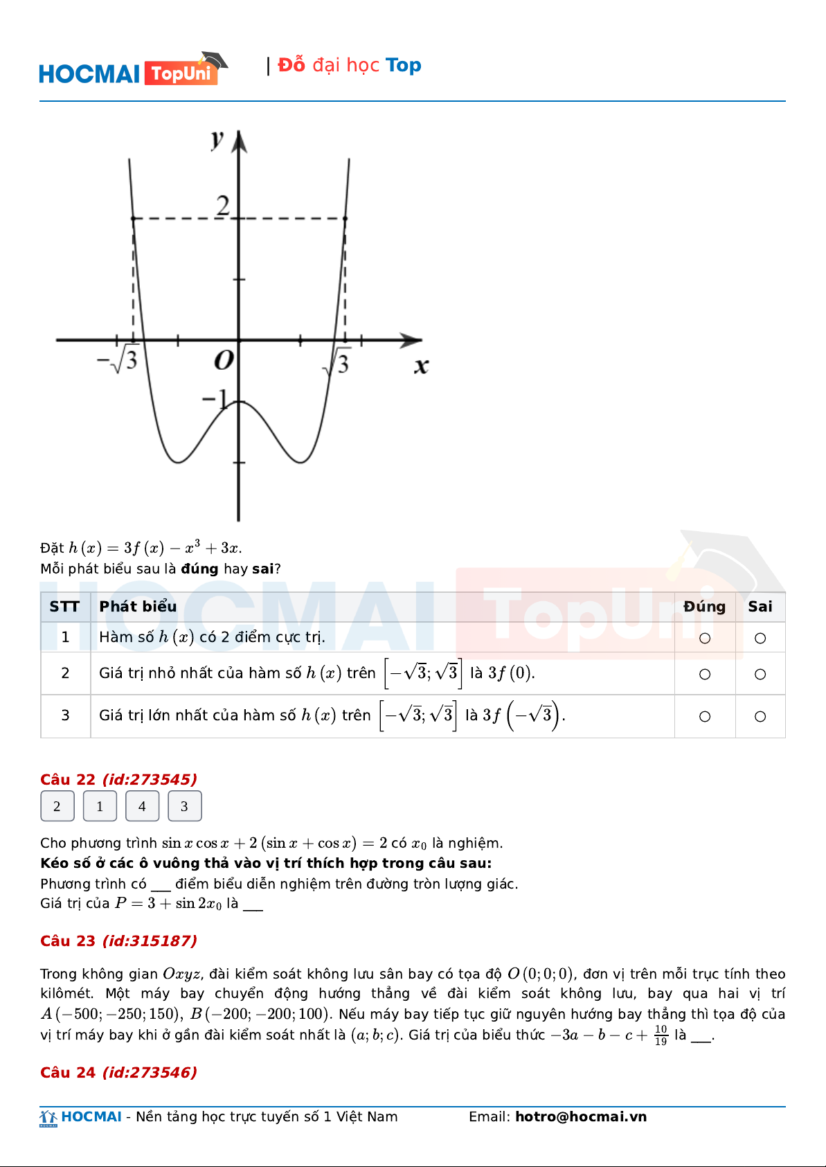 Mỗi phát biểu sau là đúng hay sai? STT Phát biểu Đúng Sai 1 Hàm số h (x ) có 2 điểm cực trị. ○ ○ 2
