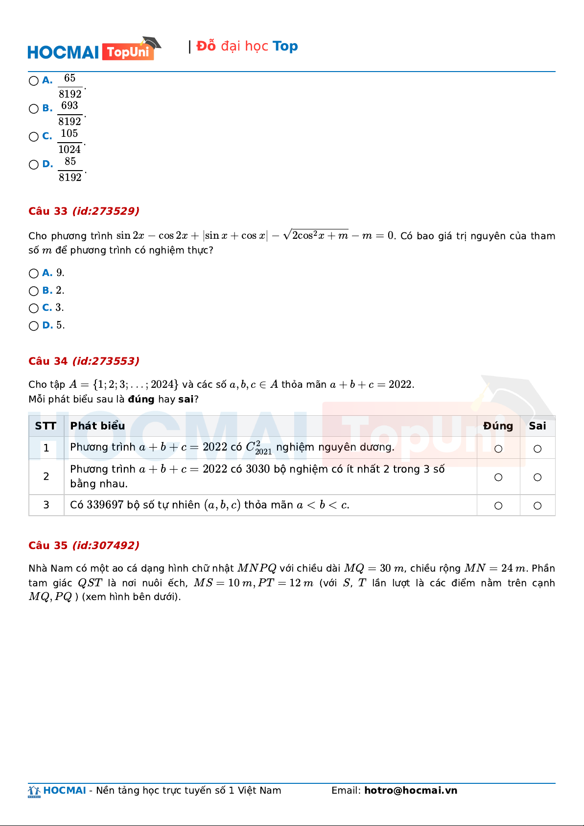 | Đỗ đại học Top ◯ A. 65 . 8192 ◯ B. 693 . 8192 ◯ C. 105 . 1024 ◯ D. 85 . 8192 Câu 33 (id:273529)