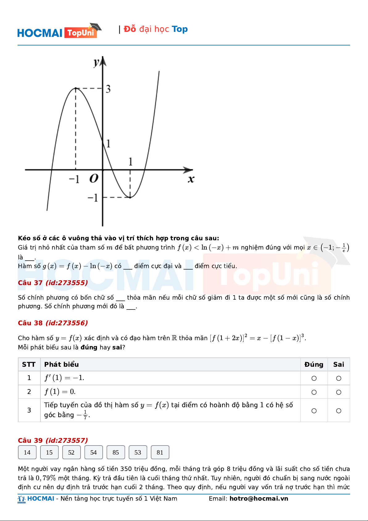 ) tại điểm có hoành độ bằng 1 có hệ số 3 ○ ○ góc bằng − 1 . 7 Câu 39 (id:273557) 14 15 52 54 85 53 81