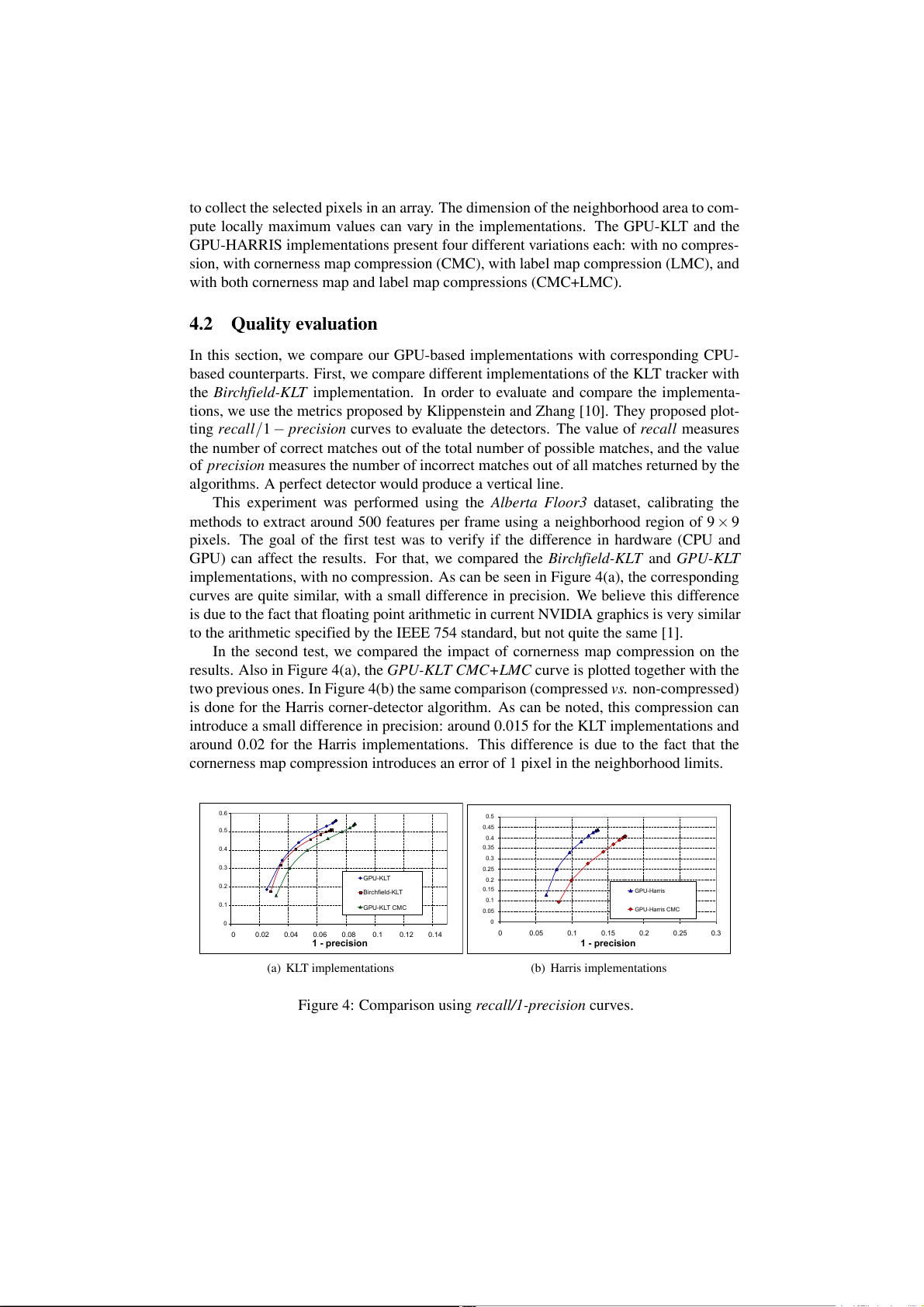 map back to the CPU is also expensive. 45 40 GPU-HARRIS upload 35 corner operator 30 select features ) GPU-KLT s download 25 (m e 20 tim HALF_GPU- 15 KLT 10 5 OpenCV-KLT 0 320x240 400x300 640x480 800x600 1024x768 0 10 20 30 40 50 Birchfield-KLT OpenCV-KLT HALF_GPU-KLT GPU-KLT GPU-HARRIS time(ms) (a) Performace (b) Workload