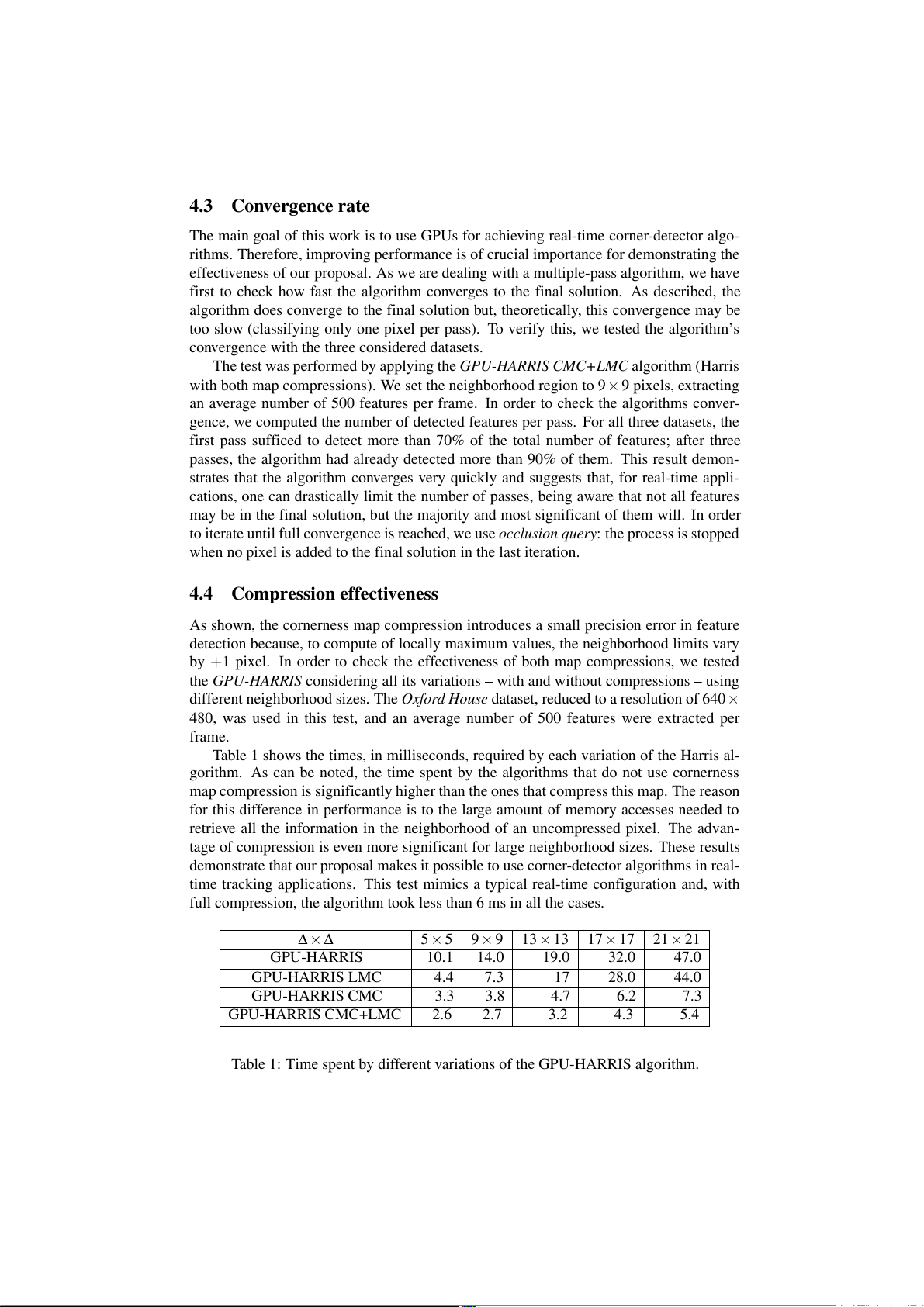Table 1: Time spent by different variations of the GPU-HARRIS algorithm. 4.5 Overall performance