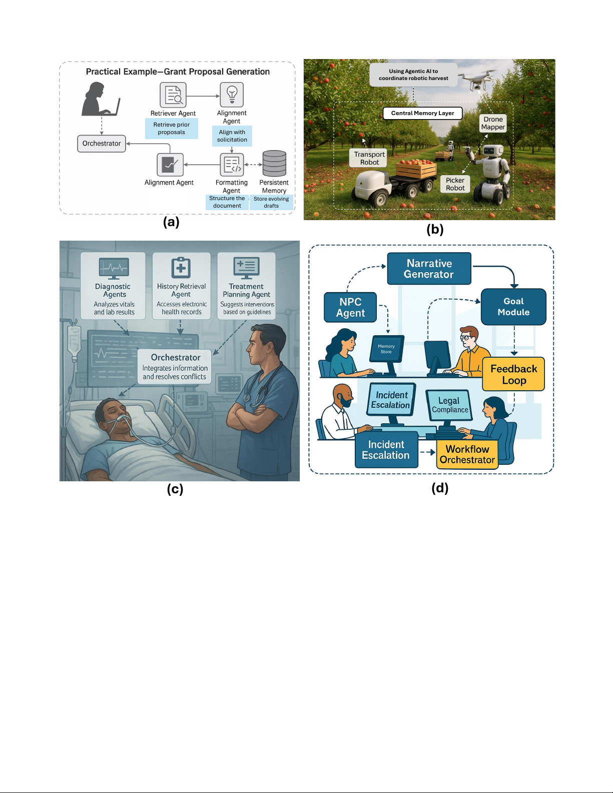 Fig. 11: Illustrative Applications of Agentic AI Across Domains: Figure 11 presents four real-world applications of agentic AI