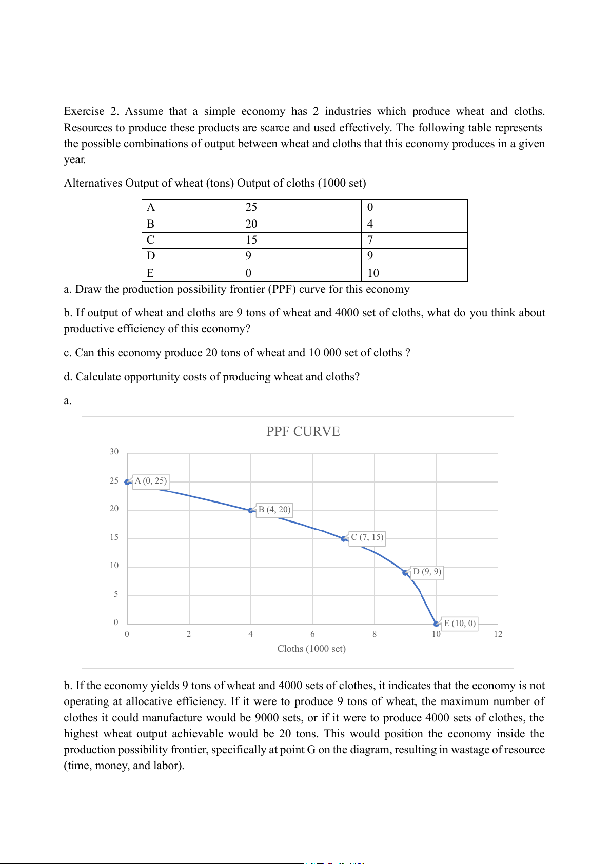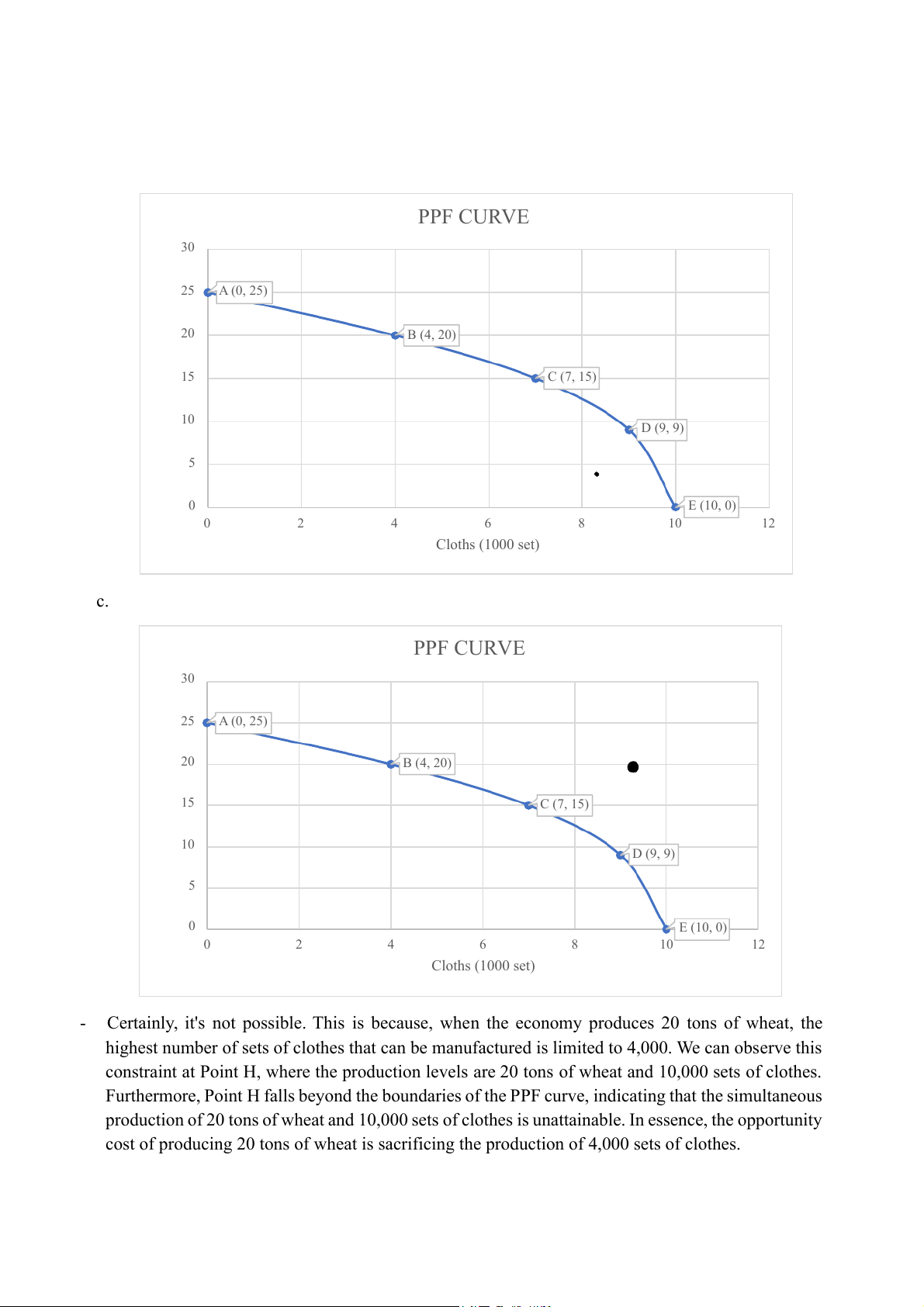 production possibility frontier, specifically at point G on the diagram, resulting in wastage of resource (time, money, and labor). PPF CURVE 30 25 A (0, 2 ) 5 20 B (4, 2 ) 0 15 C (7, 15) at (tons) Whe 10 D (9, 9) 5 0 E (10, 0) 0 2 4 6 8 10 12 Cloths (1000 set) c. PPF CURVE 30 25 A (0, 2 ) 5 20 B (4, 2 ) 0 15 C (7, 15) at (tons) Whe 10 D (9, 9) 5 0 E (10, 0) 0 2 4 6 8 10 12 Cloths (1000 set) -