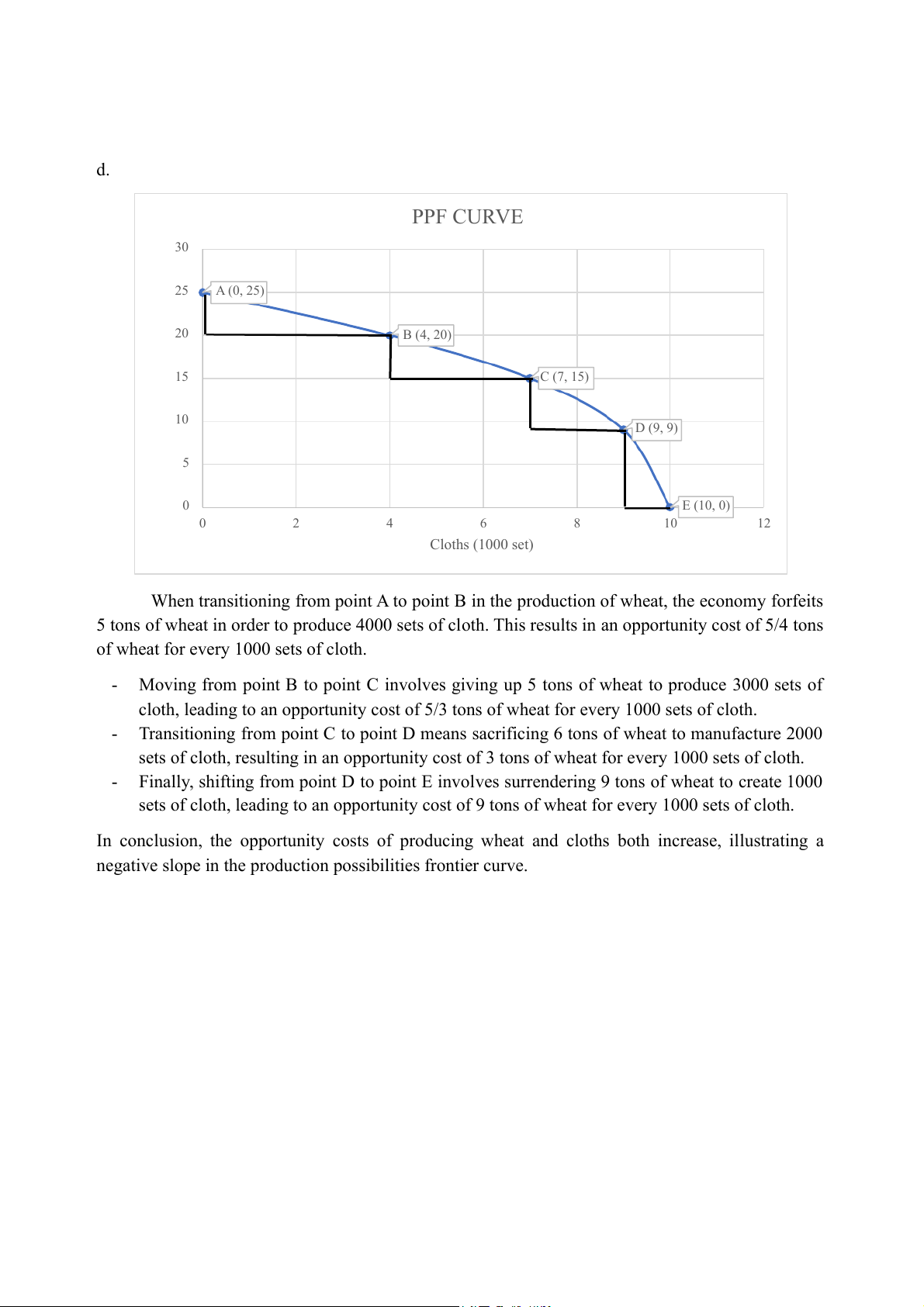 cost of producing 20 tons of wheat is sacrificing the production of 4,000 sets of clothes. d. PPF CURVE 30 25 A (0, 2 ) 5 20 B (4, 2 ) 0 15 C (7, 15) at (tons) Whe 10 D (9, 9) 5 0 E (10, 0) 0 2 4 6 8 10 12 Cloths (1000 set)